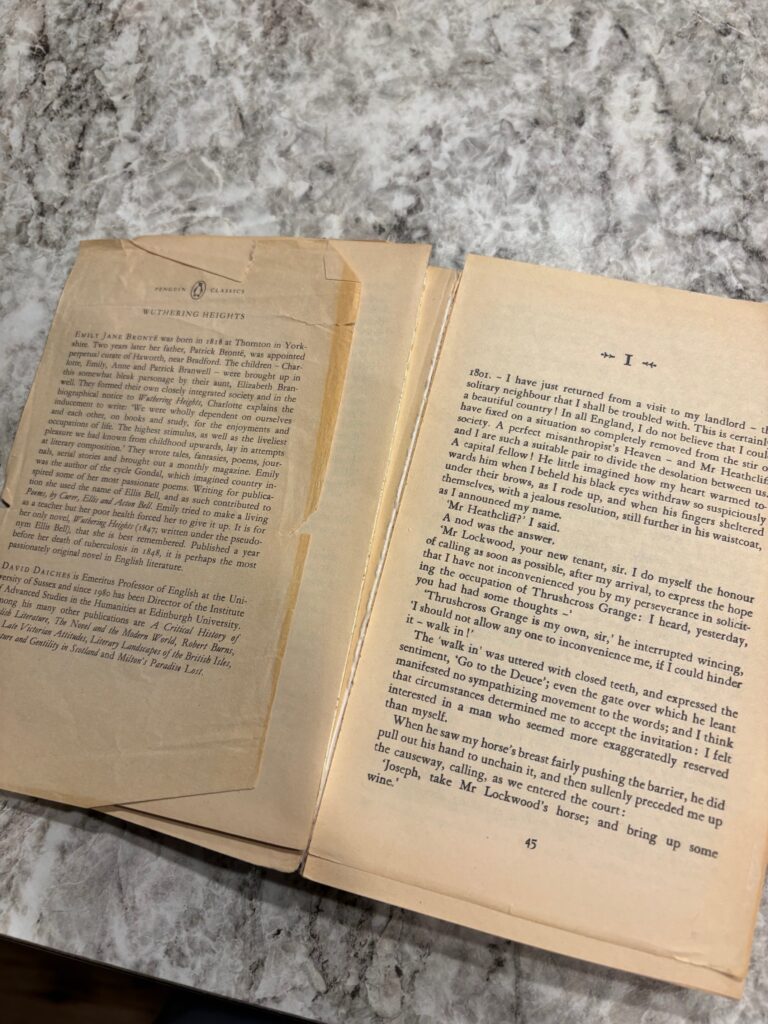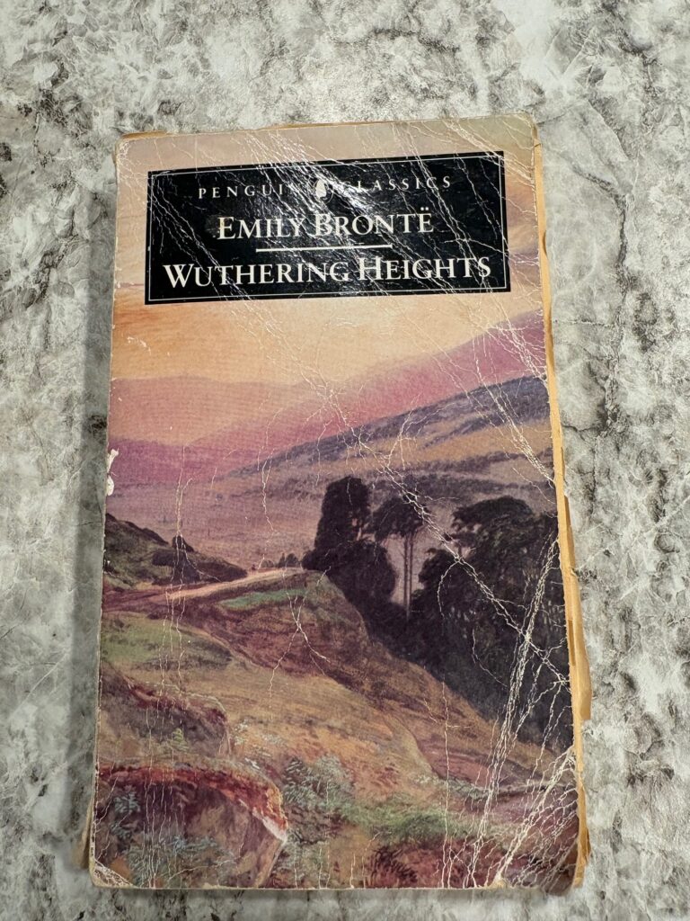 Wuthering Heights is what I’d consider a gothic tragedy. It’s set in the moors of Yorkshire in Northern England. It has always been one of my dreams to visit Haworth, the Bronte’s home. There are the requisite hero, heroine, and supporting characters. There’s a love story, a mystery, and death. As you can see from the photos, I have read this book over and over again. I won’t be reading this particular book anymore as it’s really showing its age. But, I think I’ll have to buy a hard cover copy soon. Oh, that’s not much of a review, is it? Well, read on, friends, read on.