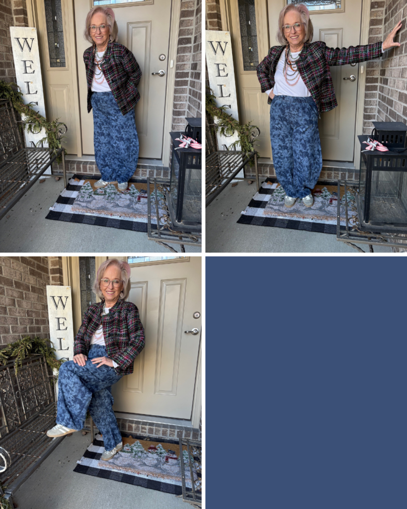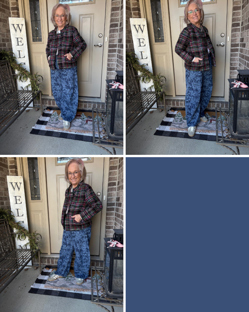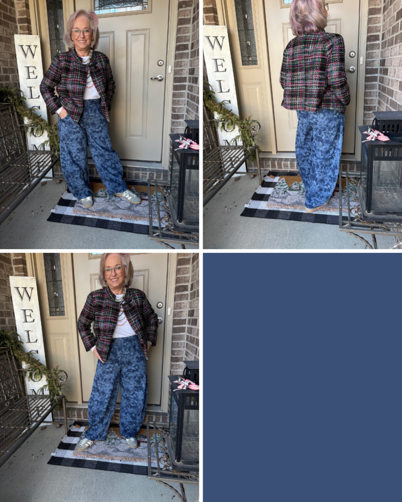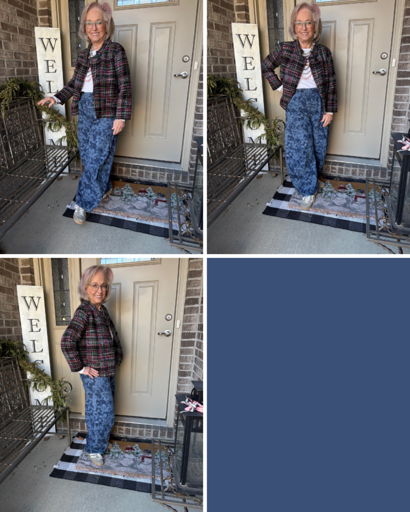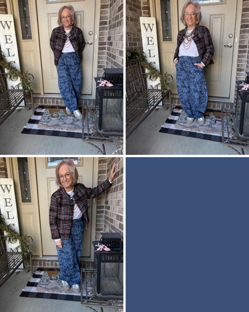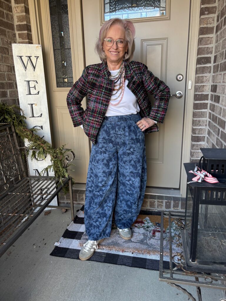 Is it ironic that the last Ageless Style challenge involved barrel jeans? Well, I took them a little bit farther with this pair. Alison from Wardrobe Oxygen posted about these horseshoe jeans from Gap. So, I thought I’d give them a try. I wasn’t sure if they might be a little bit too much, if maybe they were a little too voluminous, a little too clown-esque. Well, Nigel loved them! He rarely gives his opinion so when he does, I listen. They were on sale which was even better. But, the blue floral ones were calling my name. The angel on my shoulder was telling me, “Hey, those probably won’t even be in style this summer.” The little red guy on the other shoulder was saying, “Life is short, buy them!” Guess who won? Believe it or not, this tweed (or is it tweed-like) jacket is somewhere around 12 years old. It’s from the Michael Smaldone Talbots era…back when Talbots really was fashion. I also had a matching skirt with a trumpet hemline. I donated that years ago, but for some reason I held onto this jacket. I always loved the colors and the bracelet length sleeves. It even has pockets! I added one of my white Luxe Old Navy long sleeve tees. Does it work? Hmmm…I think so, but I couldn’t tell you why.