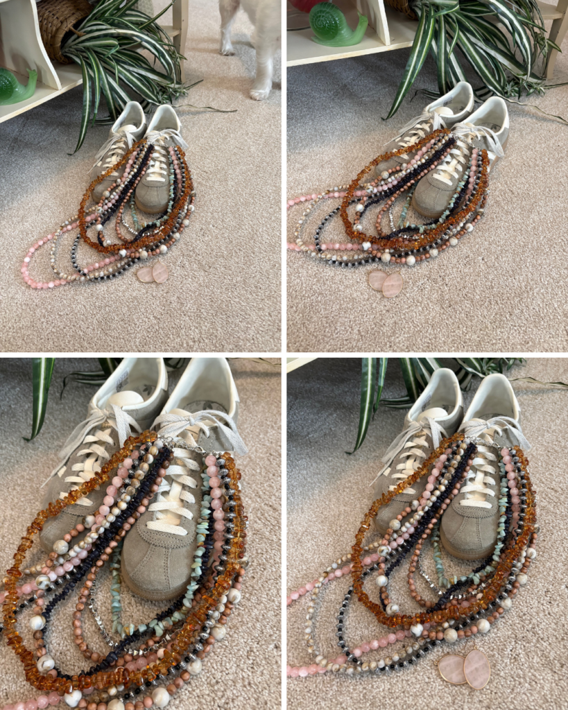 Hahaha! Now, this is getting ridiculous! I even wore the same adidas München Sneakers in silver/off white/silver. I have no idea why they call them that. They are more greige than silver, and I don’t know where the extra silver comes in to play! I forget where I got the necklace, but I bought it through one of Kellyann’s links. It’s heavy-ish, and I’m kinda afraid the clasp won’t last long. But, isn’t it just plain old spectacular? I had my choice of colors when it came to earrings. I went with these pink gold rimmed earrings from J Jill.