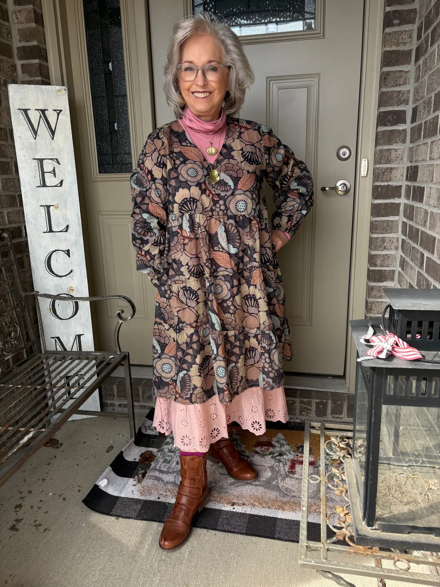 If this dress looks familiar, it’s because it’s the brown colorway of a dress I already have in the orange/red colorway. It’s no longer on the Gudrun site so I don’t remember the name of it. When it went on sale, I snapped it up because I just love the colors in this dress. I have the same print in a jersey dress. I was on my way to the museum and was pretty certain it would be chilly. I added the pink turtleneck and slip. Guess what? They aren’t the same color, and there isn’t even any pink in the dress. Did you even notice? I call them pink-adjacent! I was nice and warm all day. I love turtlenecks and rarely wear them folded over. I just like that loose, kinda sloppy look.