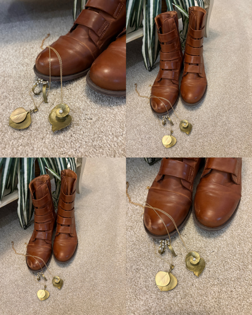 Yeah, I still haven’t taken care of the scuff on the toe of my boots. I need to get some shoe polish and fix them before they get worse. These are my brandy Leighton boots from Miz Mooz. This leather just gets softer and softer. I bought another necklace and earrings from the museum gift store by Michael Michaud. Here are the earrings, and here is one of the necklaces. I’m not sure if you can tell or not, but one of them has two separate leaves. That little stinker makes so much noise as it bounces along when I walk. I’m hoping I’m the only one that can hear it! Maybe I’ll get a reputation as the docent who has a bell on her neck to warn of my coming! (Cat, that one was for you!)