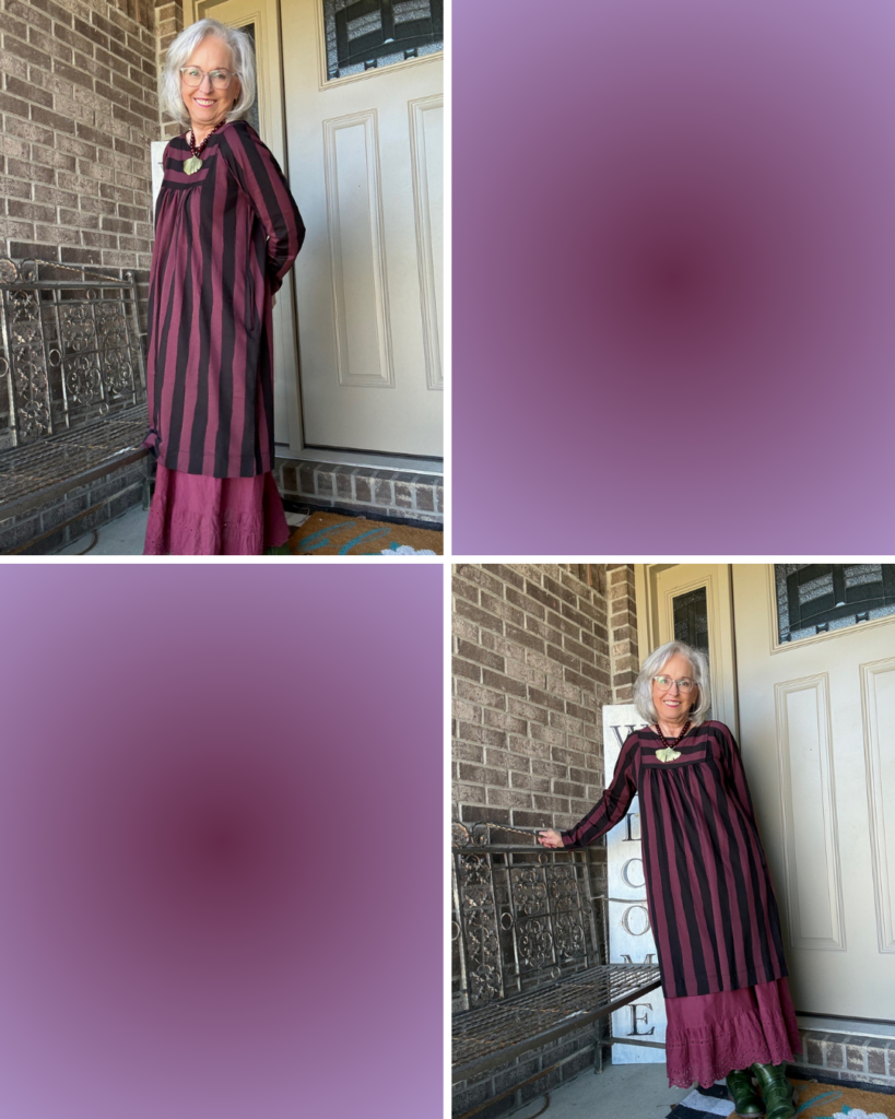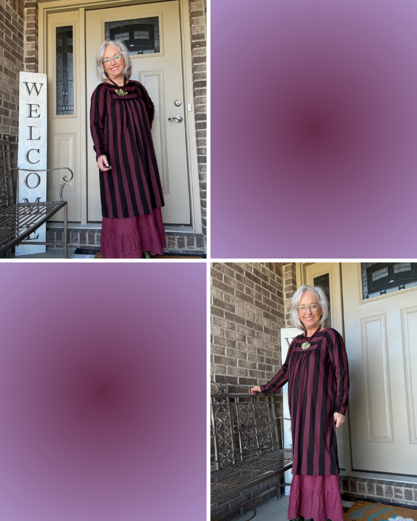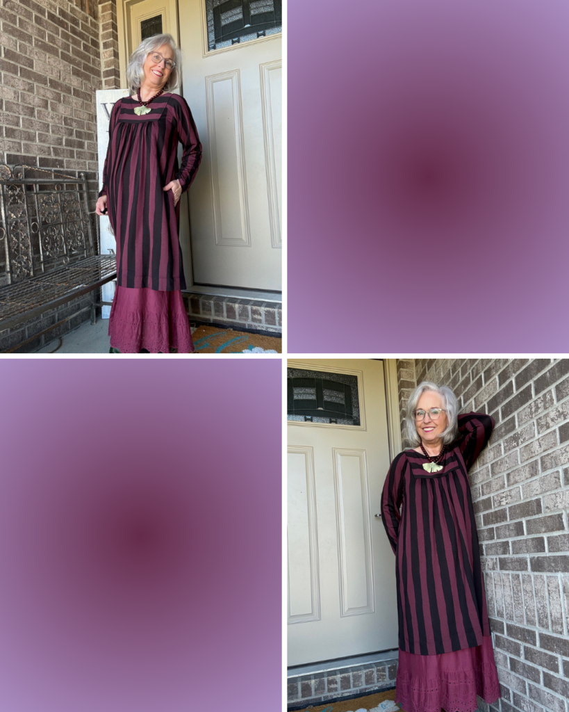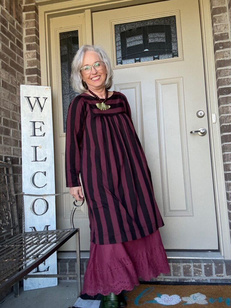 While some may think of this as a fall dress, I prefer to think of it as a transitional dress. This is the Madalena jersey dress from Gudrun Sjödén in the aubergine colorway. I also have it in the green/navy color. It’s one of those versatile dresses you can just throw on, add a slip, jewelry, and you’re out the door. As you can see, I did add a slip. I’m not sure of the color name. I have a few…cough, cough! I really do think these slips add the panache to what are really kinda ordinary dresses (unless you’re wearing one of the really colorful prints).
