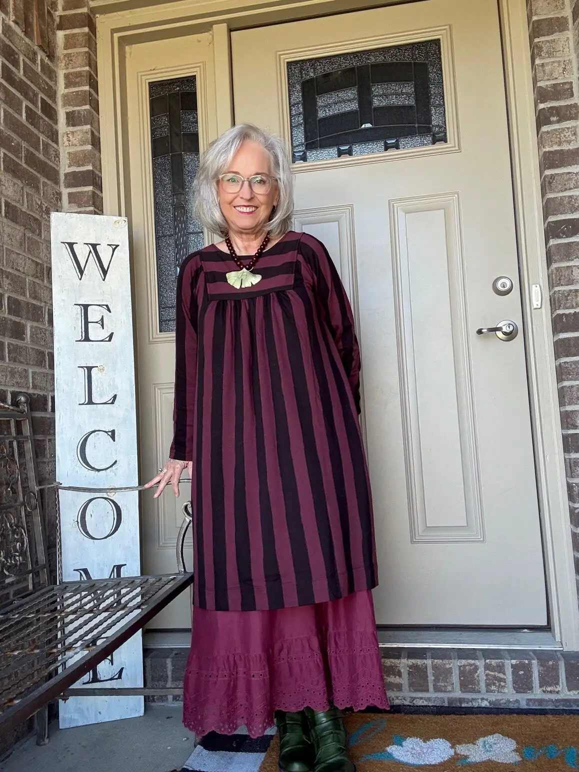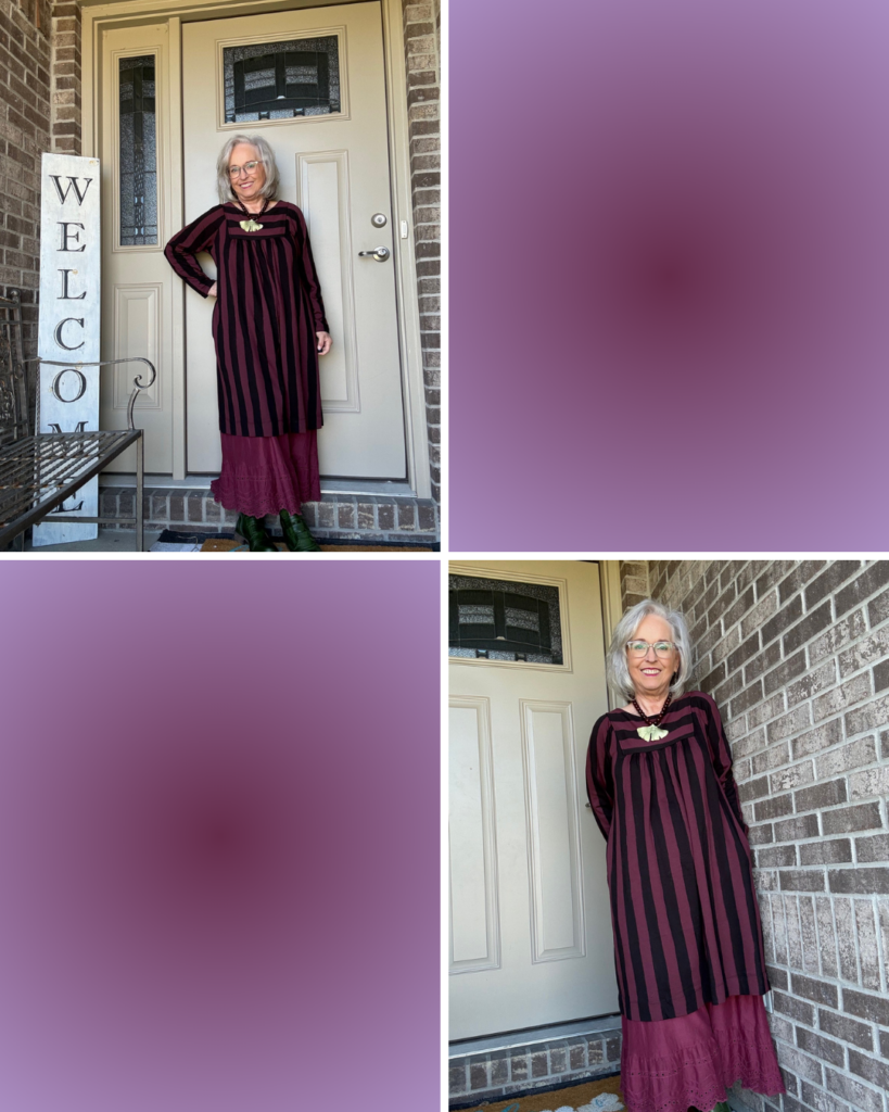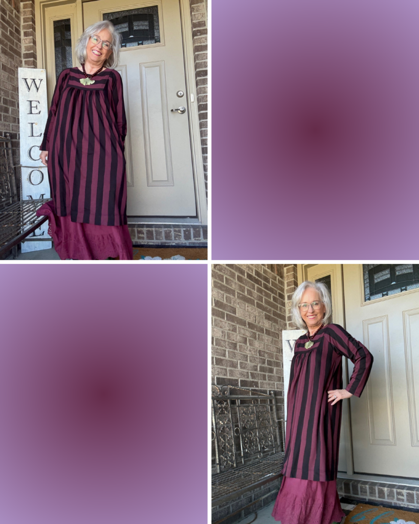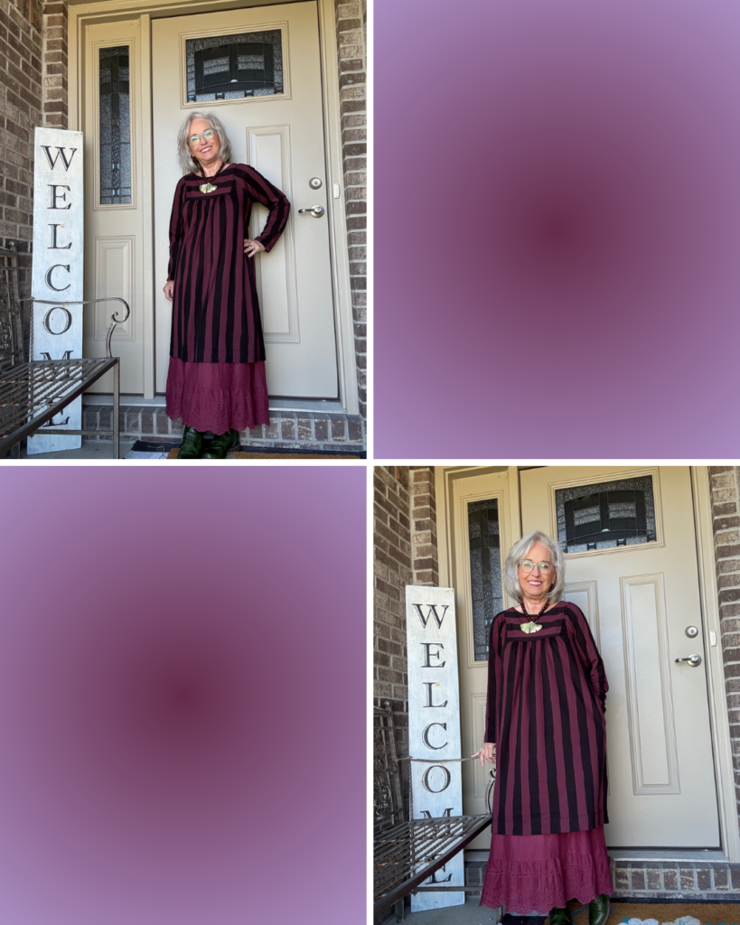 While some may think of this as a fall dress, I prefer to think of it as a transitional dress. This is the Madalena jersey dress from Gudrun Sjödén in the aubergine colorway. I also have it in the green/navy color. It’s one of those versatile dresses you can just throw on, add a slip, jewelry, and you’re out the door. As you can see, I did add a slip. I’m not sure of the color name. I have a few…cough, cough! I really do think these slips add the panache to what are really kinda ordinary dresses (unless you’re wearing one of the really colorful prints).