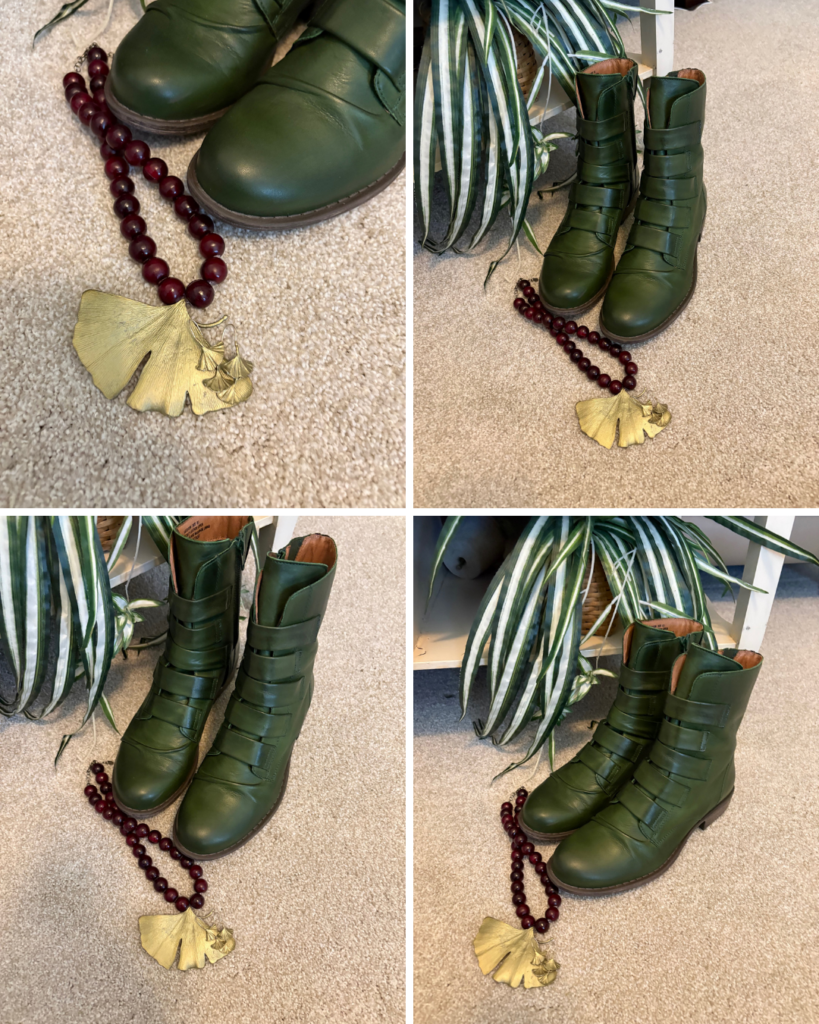 Well, you can probably tell! Someone splurged on another pair of Leighton boots from Miz Mooz. I wasn’t sure about the green color as they seemed rather bright on the Nordstrom site. But, they’re actually a really lovely shade. I decided to follow Jodie’s recent advice about not bothering to match your shoes to your outfit. And, they aren’t the reds/greens one associates with Christmas so I’m more than happy to wear them with this dress. I thought this large gingko necklace on these burgundy beads from Michael Michaud was the perfect necklace. I added my Triple Leaf Gingko earrings because I do like my jewelry to match! I bought all of these from the museum gift shop.