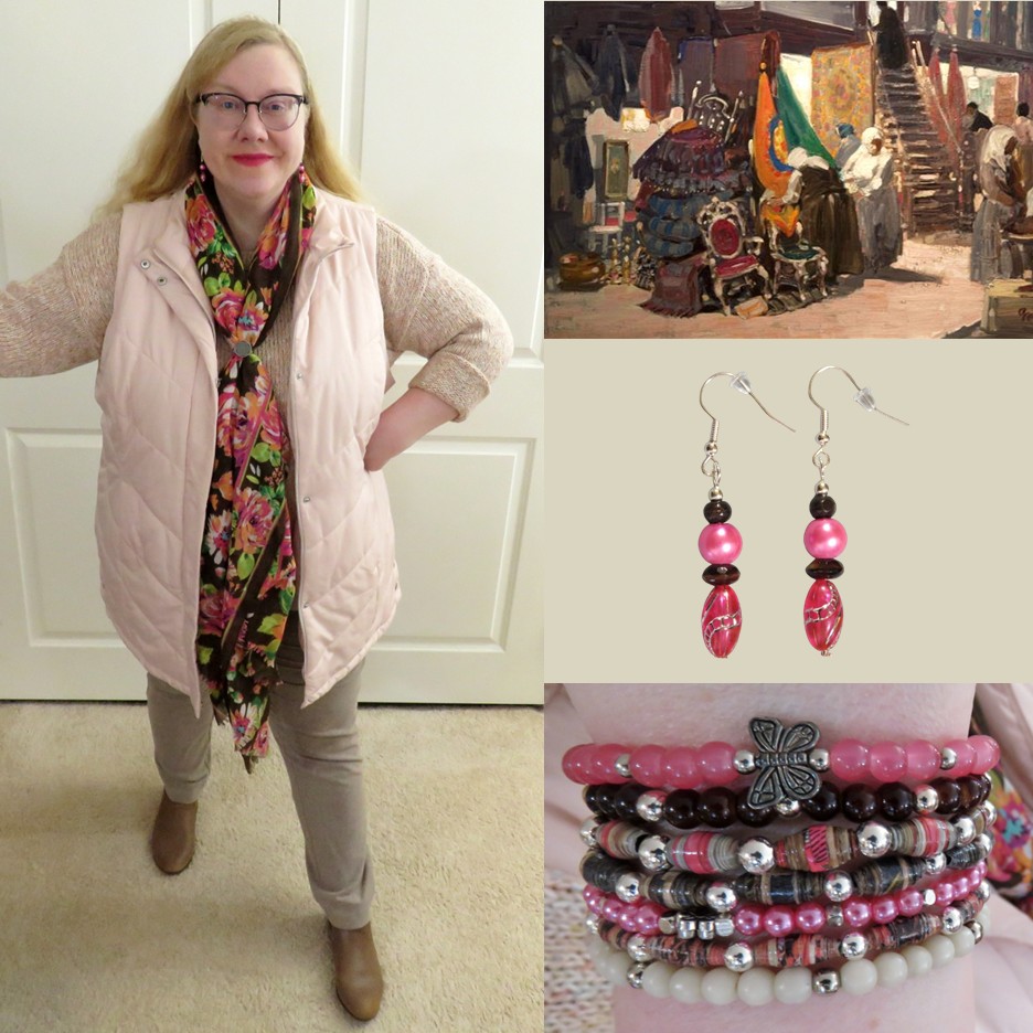 First up is Sally from Within a World of My Own. She says, “Unsurprisingly, color lover that I am, I focused on the lighter part of the painting as the inspiration for my look. The green, orange, and magenta section of the painting where the women have stacked furniture and draping fabric led me to pick out this new-to-me thrifted floral scarf as the centerpiece of my outfit. The soft pink ground and beige hanging rug inspired my blush pink and taupe-beige base outfit. I finished the look with DIY bracelets and earrings that coordinate with the scarf. I flipped the ratios of light and dark from the dark-based artwork to a light-based outfit to create a look that suited my desire for a more “spring-like” vibe.”