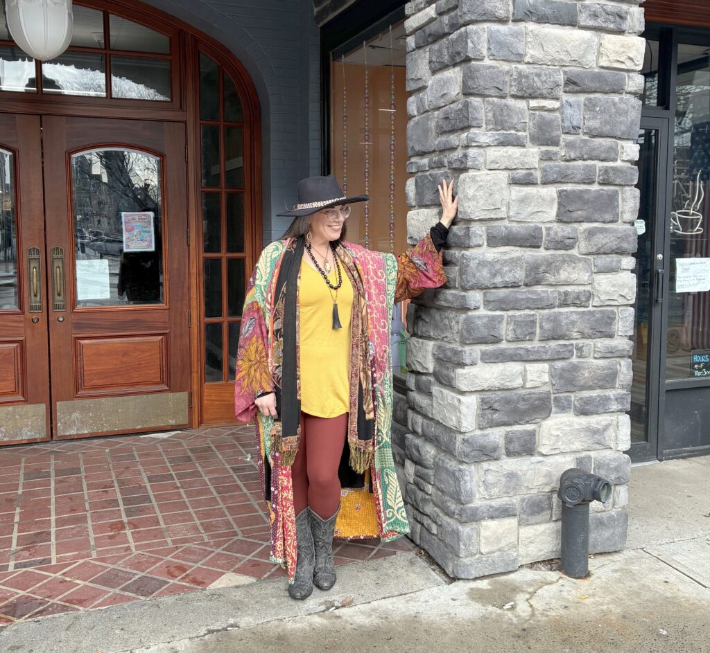 Finally, here I am! It seems, with Style Imitating Art, I either choose Kantha Bae or April Cornell. This time, I went with two Kantha Bae pieces. I saw (or maybe I just chose to see) more bright colors than dark (kinda like Sally). So, I pulled out this Crepe Sari Dahlia Duster dress and wore it over a Pixie Skirt in much darker colors. I was pretty pleased with it for an SIA challenge, but I wouldn’t wear it anywhere. The skirt has a very voluminous waistband and bunches up the dress a bit too much for my liking.