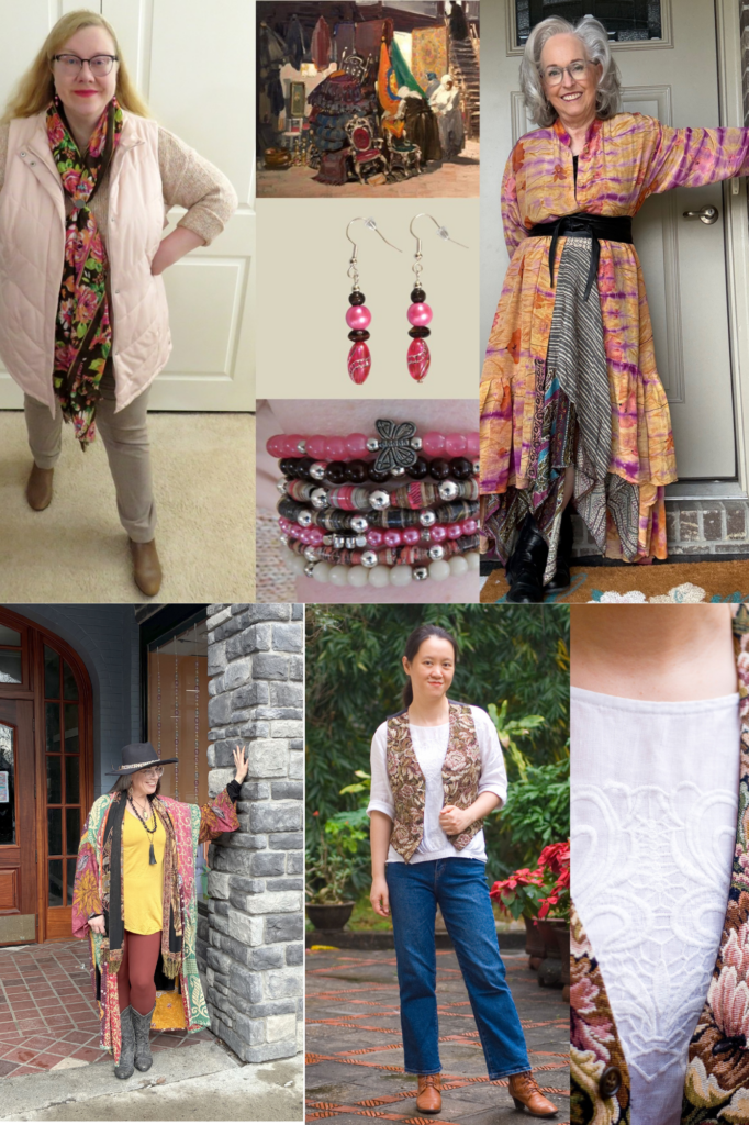 Next up is Shelbee who writes, “I was thoroughly stumped for this one but as I walked into my closet room, my old Kantha Bae robe was hanging on the door and it struck me as the perfect piece for this artwork. The patterns and colors very accurately capture the feel of the garments and tapestries hanging in the market in the painting. Although I have worn this robe for two previous SIA challenges (“Les Muses” by Maurice Denis and “The Garden of Hesperides” by Edward Burne-Jones) I never hesitate to restyle something in my wardrobe. It shows that I actually do wear the things in my closet on repeat! Since the robe was doing most of the work for this challenge, I created a base layer in yellow and rust with black accessories because those three colors seem to dominate the painting. I was fairly happy with the result of this outfit except this yellow tee shirt seems to pull and tug in all the wrong places! ”