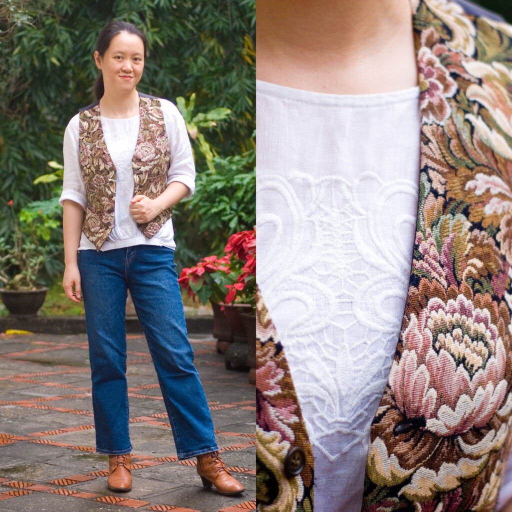 Here is Salazar who writes, “I was struggling with this, but then your comment about the painting being bright colors surrounded by darker shades gave me an idea, so I went with this white blouse paired with my tapestry waistcoat, jeans, and lace-up boots. The embroideries on the blouse and the pattern on my waistcoat are a nod to the details in the painting as well (the store in the center of the painting is displaying carpets/upholstery, so the tapestry totally fits!) It’s a bit of a loose interpretation, but I’m happy with it.”