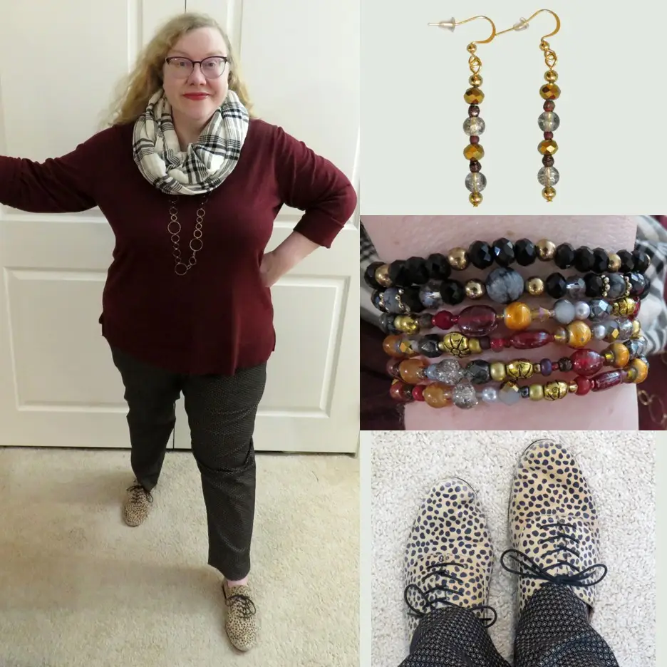 Sally’s interpretation is: “I loved how this painting lent itself so well to a print mix outfit even though it doesn’t contain any prints.  I wanted to get the color scheme, the geometric nature of the buildings, and the spots of warm light into my outfit, and a print mix was the best way to do it from my closet.  I finished off my look with hand-made earrings and bracelets: the combination of a four-wrap memory wire bracelet stacked with two individual stretch bracelets was an experiment, but I really liked the result.”