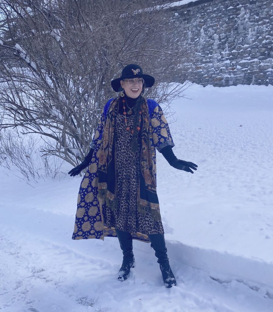 Shelbee says, “This challenge turned out to be really easy. I had just shared photos of my new blue and gold silk robe layered over a leopard print dress and I realized the colors and mixed prints really captured the essence of the nighttime Harlem scene. I added an old patterned scarf because the colors were perfect and it really added to the chaos of different prints. I wore gold jewelry and black accessories to represent the dominant black and gold colors in the painting. There is also a significant amount of red in the painting so I added a bold red statement necklace and there are some red crystals in the rooster brooch on my hat. I was really pleased with how this outfit turned out but I think my snowy white background detracts from the dark moodiness of the artwork. But I cannot control the weather so I shall not fret about it!”