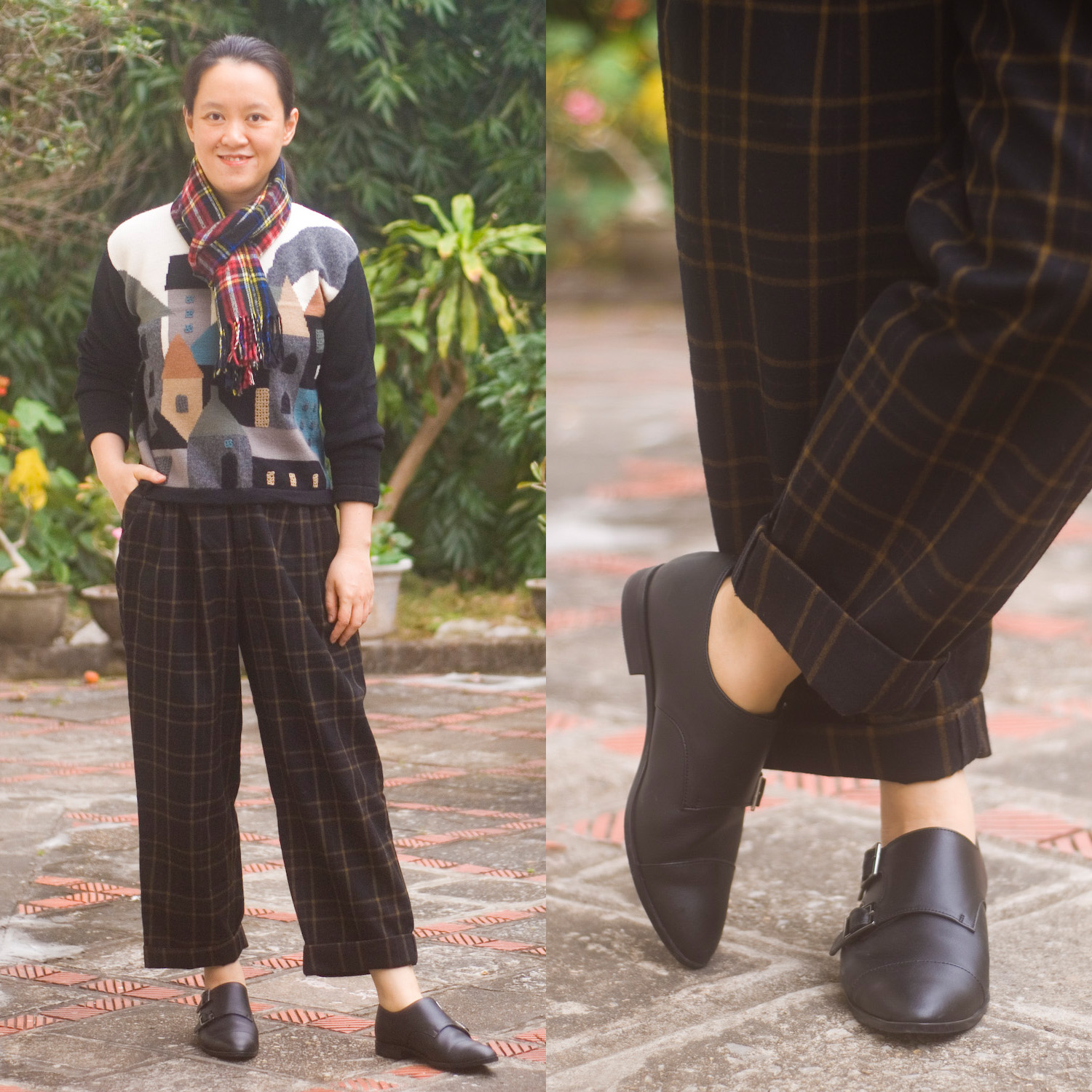Next up is Salazar who says, ”I knew right away I’d wear these trousers – the yellow plaid on the black background is perfect for the strong lines in the painting – but for the top, I had to think a bit. At first, I was going to wear one of my celestial sweaters to mimic the lights, but then I remembered my “cityscape” sweater. The colors are a bit brighter, but the city scene is too perfect to pass up. I also added my scarf as a nod to the subtle touches of red and blue in the painting.”