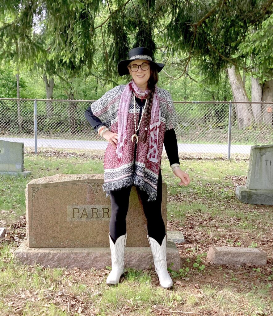 Shelbee has this magical closet. She says, “It is still cool enough here to be wearing sweaters and boots and I wore this outfit for three days straight the week before you sent us the art. I had washed it all and the poncho was folded on top of a pile of clothing waiting to be put away. At the end of Monday’s art post, I wrote this…’May the closet magic work its magic!’ So then I walked into my closet room to brainstorm outfit ideas for this challenge and my eye immediately went to the folded up poncho sweater. Literally everything about it resembled Katherine’s dress from the color palette to the black vertical stripe going straight down the front. The closet magi really did work its magic! Since I had worn the outfit for three consecutive days, I decided to wear it exactly as I had before with black leggings, white cowgirl boots, a burgundy paisley scarf, a black straw boater hat, my horn necklace, and feather earrings. By sheer coincidence, much of it represented different details from the painting. The scarf for her collar, the beads on my necklace for her pearls, my feather earrings for the feather in her hat. The only thing I added specifically for this challenge are the stacks of beaded and pearl bracelets just because I wanted more pearls.”