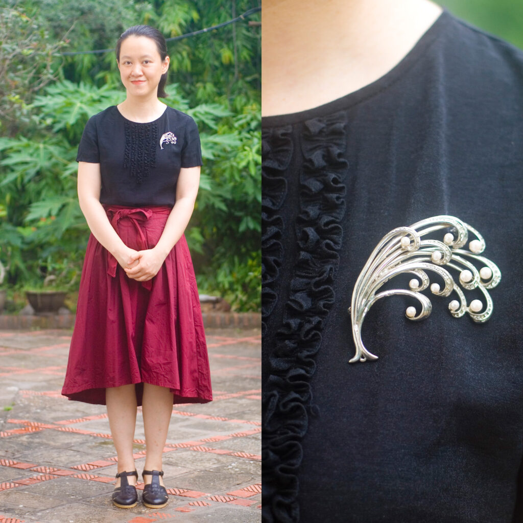 Next is Salazar! She says, ” Since it’s the summer, I had to think a bit differently about my outfit, and in the end, I went with this black-and-red combo. My skirt is a nod to Catherine Parr’s red gown, and the ruffles on my top are a weather-appropriate reference to the intricate embroideries and other trimmings. And of course, I had to add a brooch to reflect her pearls and the feather in her headdress as well!” I told you, Salazar has always has a brooch or piece of jewelry that meets the brief!