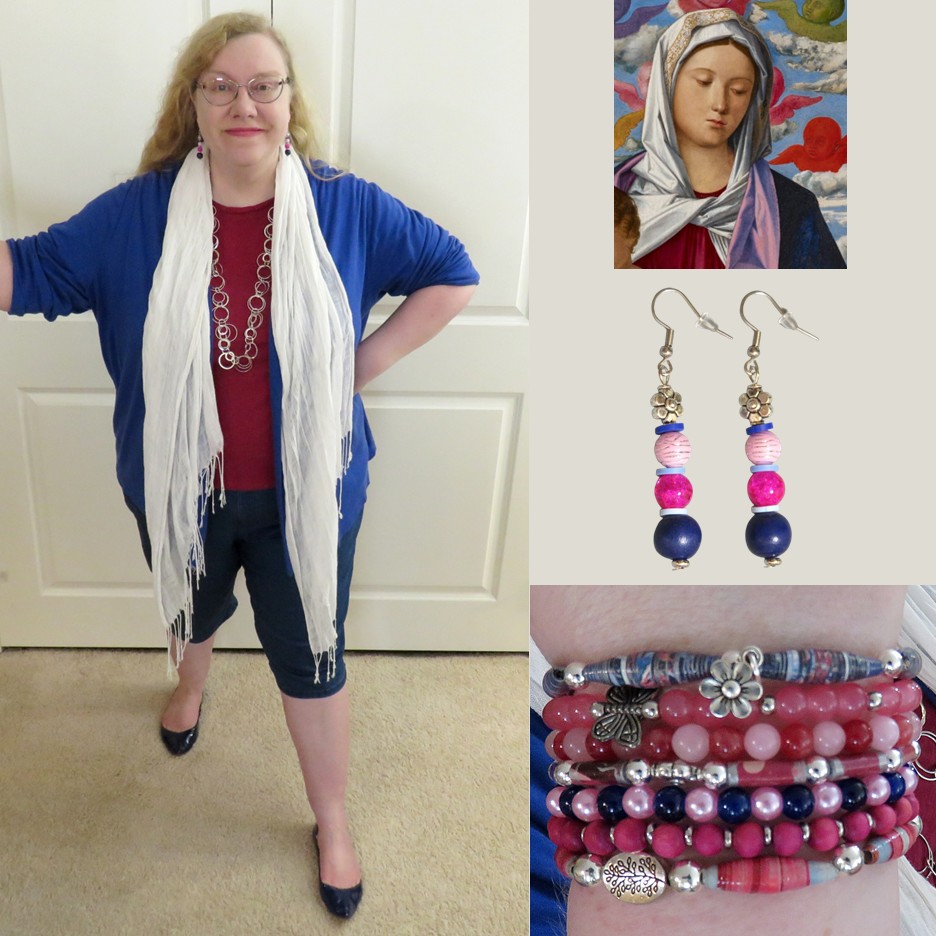 We welcome Sally back to Style Imitating Art! She says, “went with a fairly literal interpretation of the artwork this time, inspired by the colors and layers of Mary’s outfit. (I’m sure she wasn’t wearing knee length shorts, but I bet she would have liked their practicality as the mom of a baby.) Mary’s dress looked both red and pink to me so I split the difference with a magenta T-shirt and topped it with a blue cardigan and white scarf (that I left long and flowing rather than in an elaborate style on my head). I finished up the look with a purchased silver necklace and some DIY jewelry that I made to coordinate with a navy/blue/pink cardigan in my wardrobe. This look is very high contrast for my coloring but I still enjoyed the drama of it. I feel that it’s rare for me to wear a fully color blocked outfit that doesn’t have any print pieces so I appreciate that this challenge spurred me to do that.”