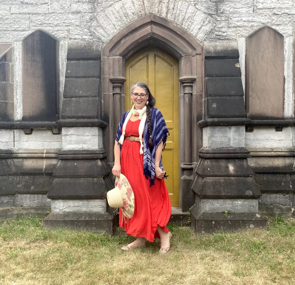 “For the second outfit, I layered a blue, white, and lavender ruana over a red maxi dress to capture the colors and flow of Mary’s clothing. My belt and shoes are gold to represent all the gold trim on the wood panel. I wore a long ivory scarf that my mother, whose name was also Mary, made for me. My floral straw hat brings in the green and red of the cherubs in the background. And the yellow door is for the yellow cherubs.” This is the outfit that made the final cut!