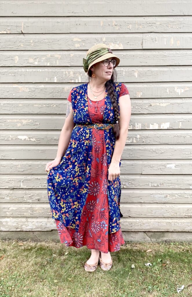 Shelbee came up with two outfits. She says, “The first outfit consists of some recently thrifted pieces including the red floral dress and blue floral vest. The colors in both pieces reflect all of the wonderful colors in the artwork. I added a green ribbon to my hat for the green cherubs and wore the same gold shoes as the first outfit. My gold necklace features a tiny cross pendant to bring some religion into my outfit.”