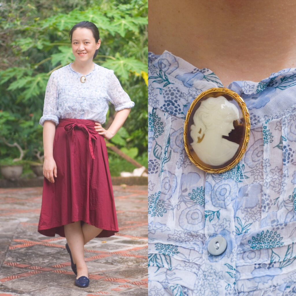 First up is Salazar! She says, ”I went with this pale blue floral shirt to reflect the blue sky, the red skirt to reflect the red robe, and navy flats to reflect the blue outer robe. I also accessorized with my cameo brooch because of its classical silhouette, and the gold frame is a nod to the frame of the painting too.”