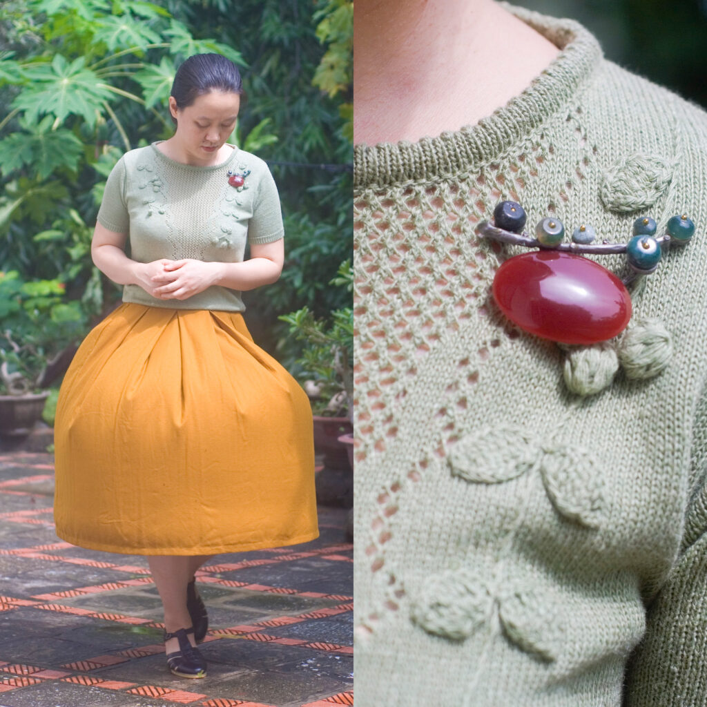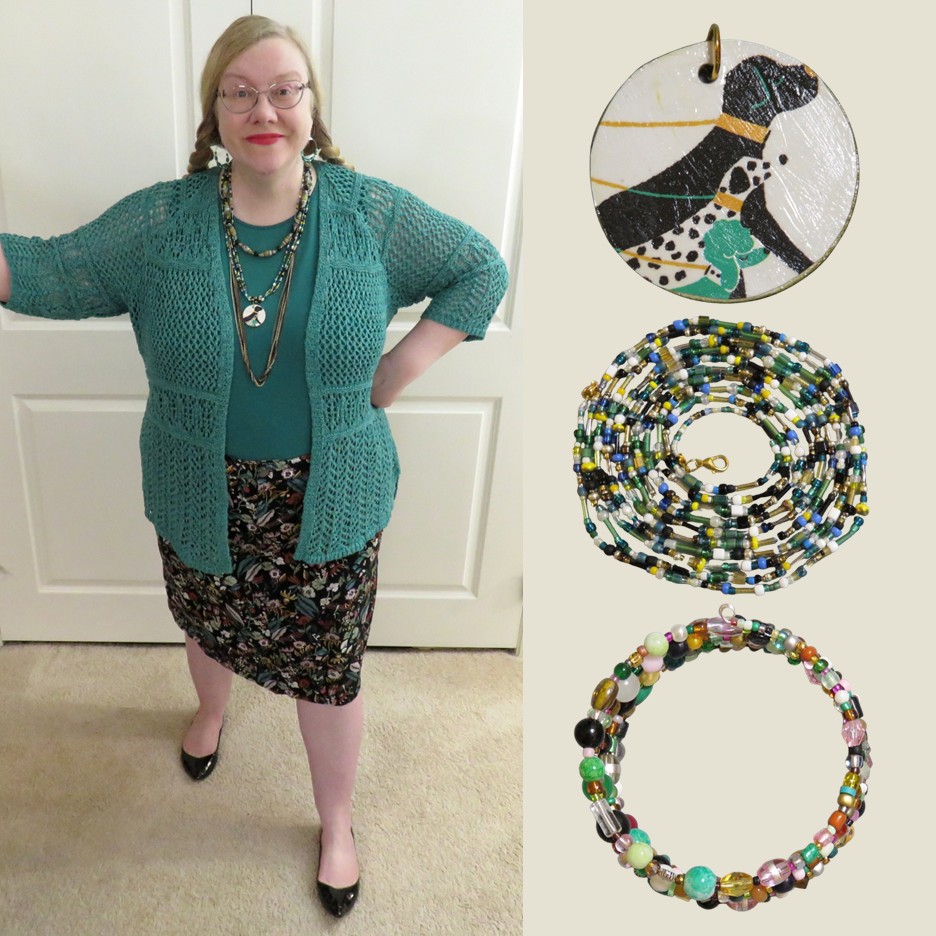 Sally says, “The autumnal color palette and variety of irregular shapes in the painting reminded me of a black botanical print skirt in a similar color scheme, so I built my outfit around that. I added a modern twin set of tank top and sweater in similar shades of green and finished off the look with some handmade jewelry as usual. The paper pendant with three dogs on it didn’t have any direct counterpart in the artwork, but (1) it had a whimsical vibe that worked with the painting and (2) who’s to say some of those shapes aren’t dogs?”