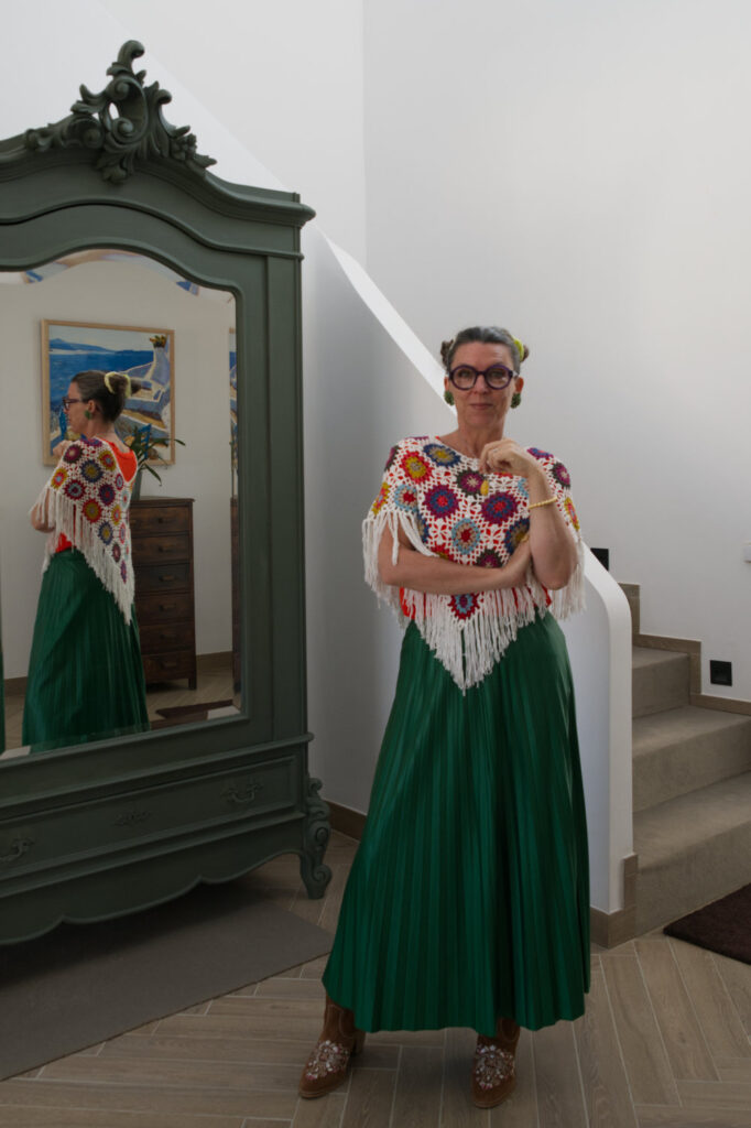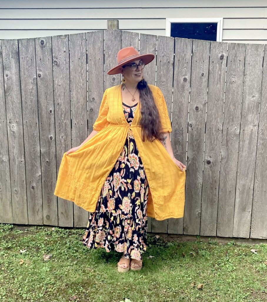 Here is Suzy! She says, “I ended up in a green pleated skirt paired with a colourful crochet poncho and my brown floral cowboy boots (all from Vinted!), as well as an orange v-neck tee. It wasn’t intentional, but the end result gave off a bit of a boho-country vibe — like I might have wandered out of a music festival somewhere in rural Portugal! Ideally, I would have chosen something bold in mustard yellow but my wardrobe just wasn’t giving me that…so I threw my hair up in two very messy buns and used yellow scrunchies to tie them. I figured I would wear some yellow jewellery as well, but it turns out the only yellow jewellery I have is this little necklace which is difficult to see with the poncho, never mind.”