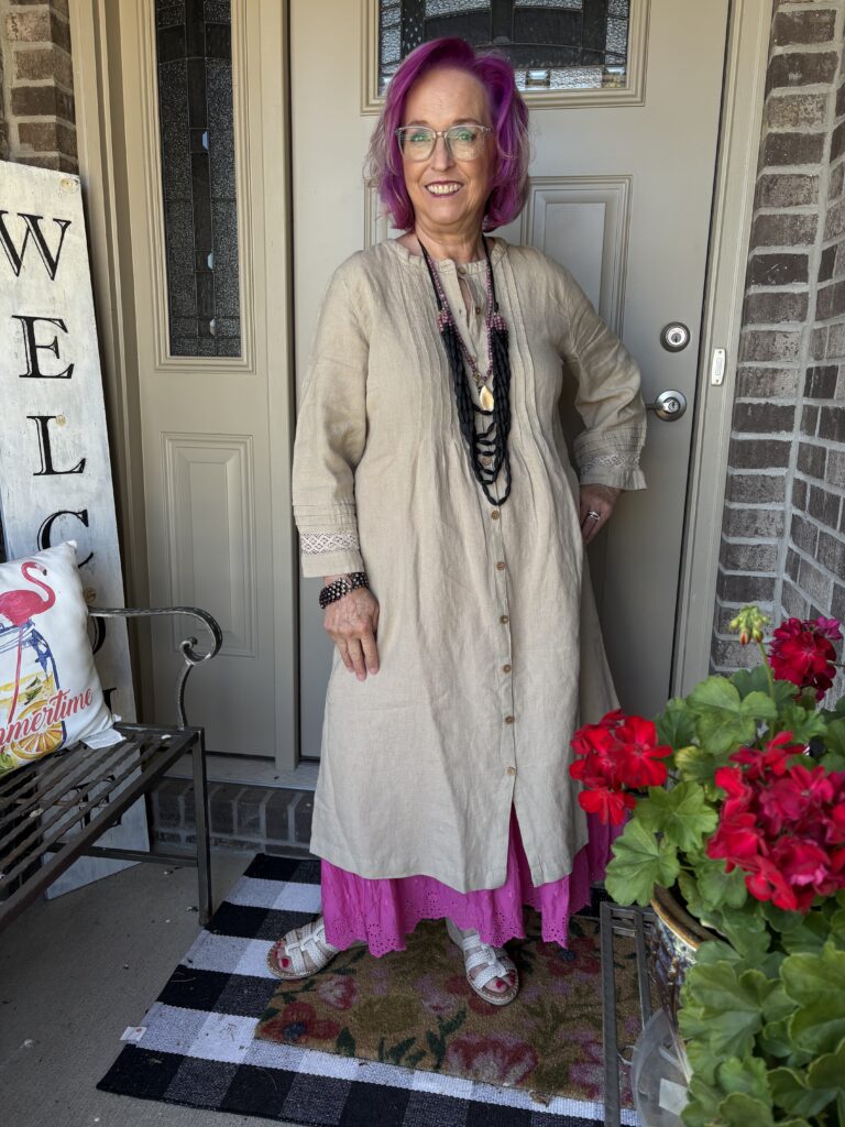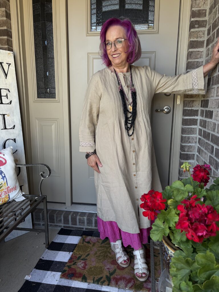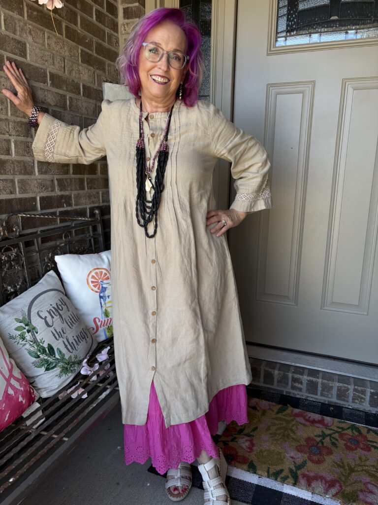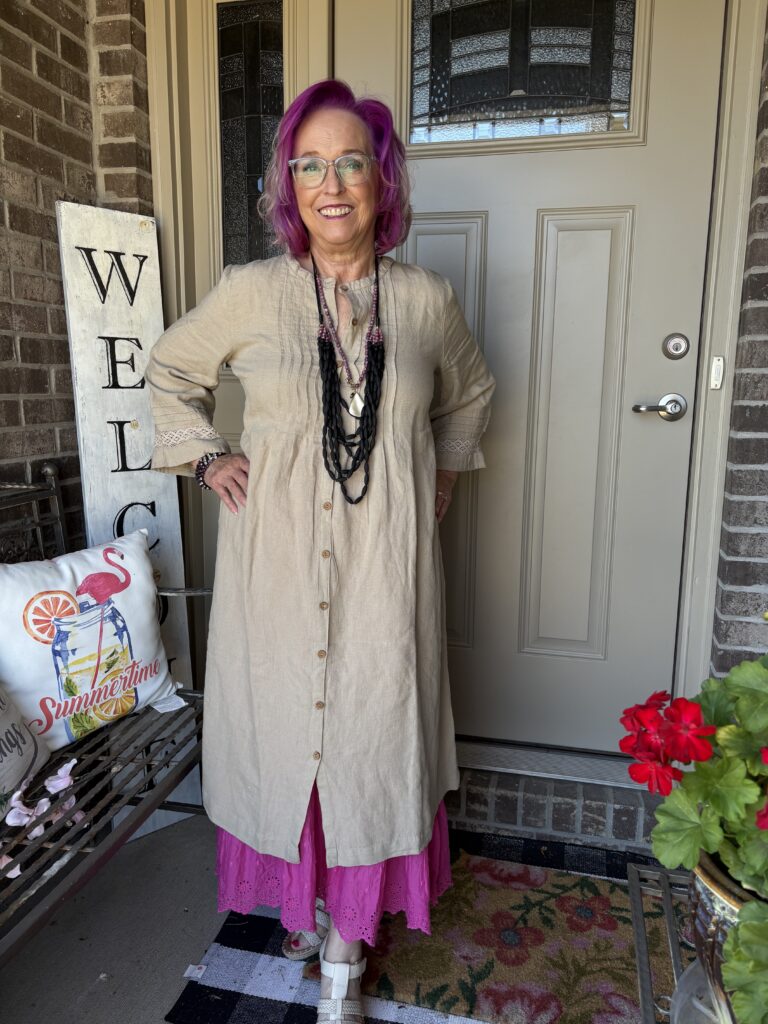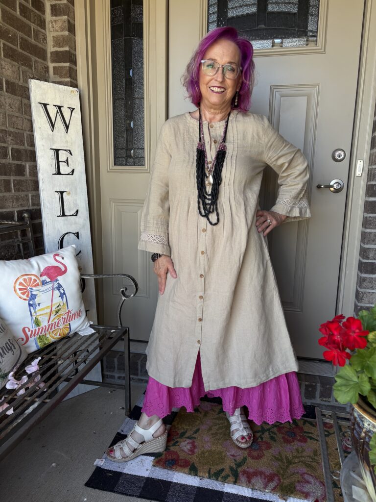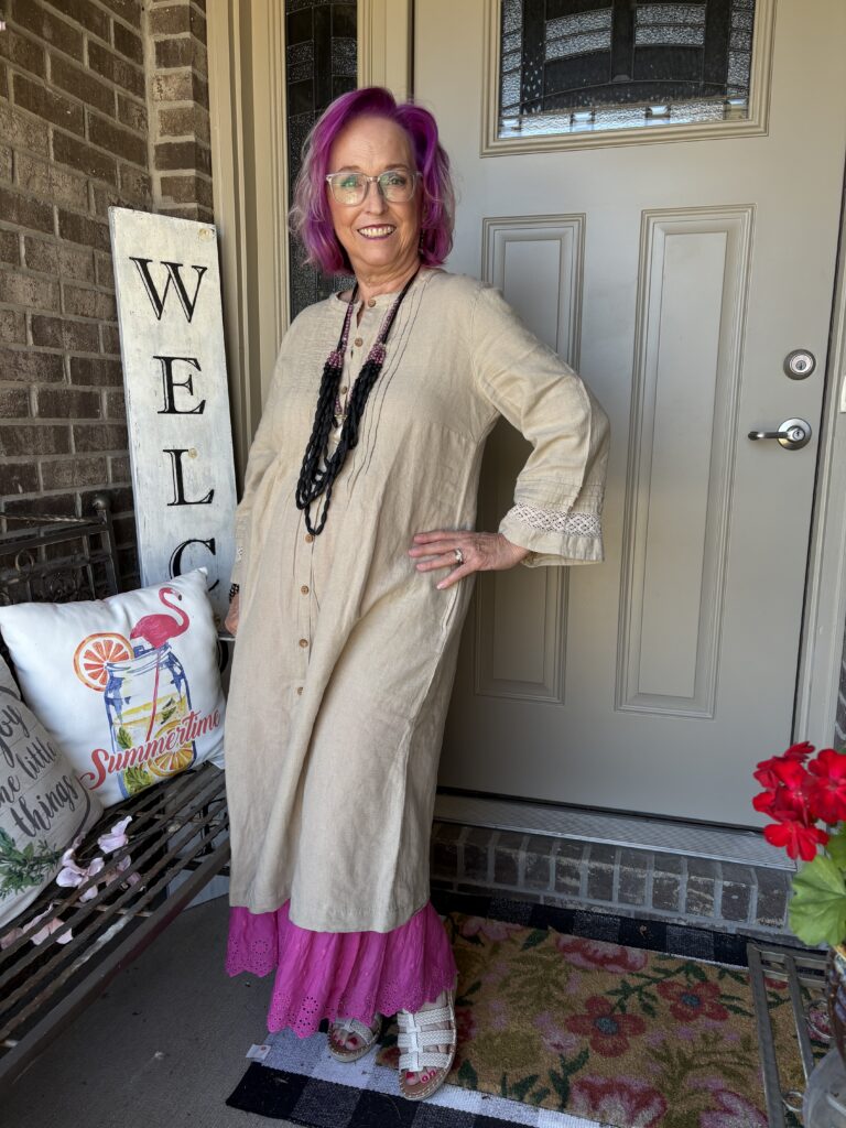 You may have noticed something new! Yes, I got a new dress from Gudrun Sjödén. Nah…well, I did get a new dress, but my hair stylist added these merlot, purple, and hot pink colors in my hair. She also added a lavender (I think) glaze on the part that wasn’t colored. These are fashion colors which will gradually fade away. The downside to these is I have to wash (or condition) my hair in icy cold water. This is the Sand dress from Gudrun Sjödén. The name is rather appropriate, isn’t it? It’s actually called Dark Natural. I added a pink slip to bookend my look!
