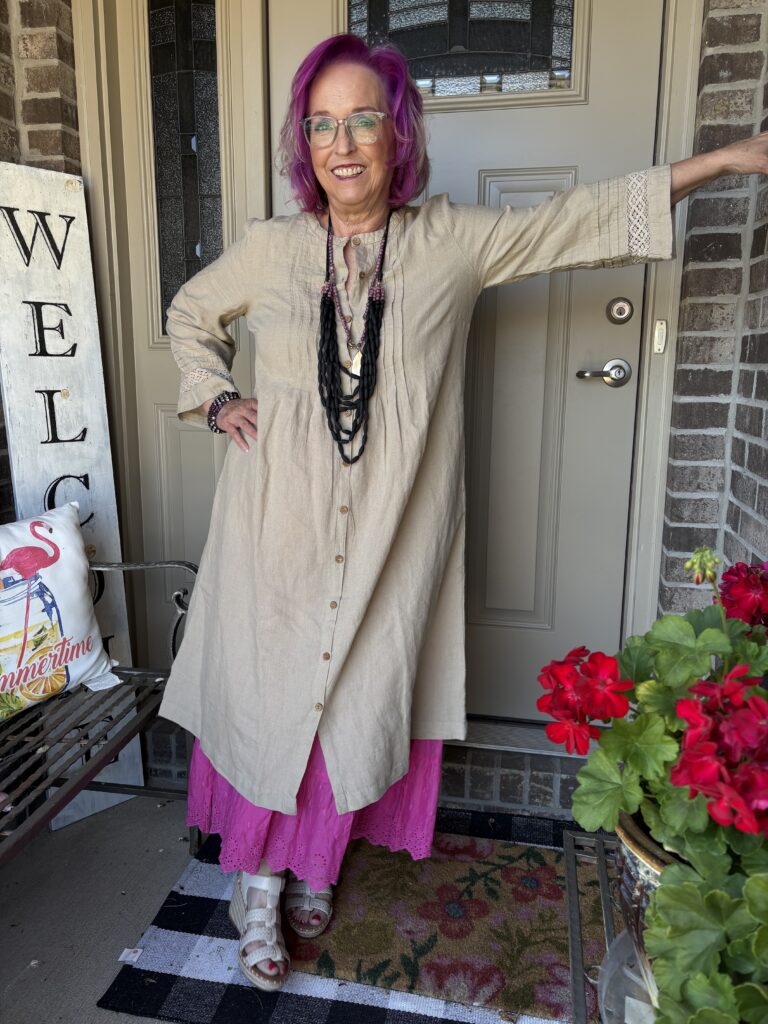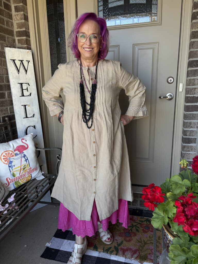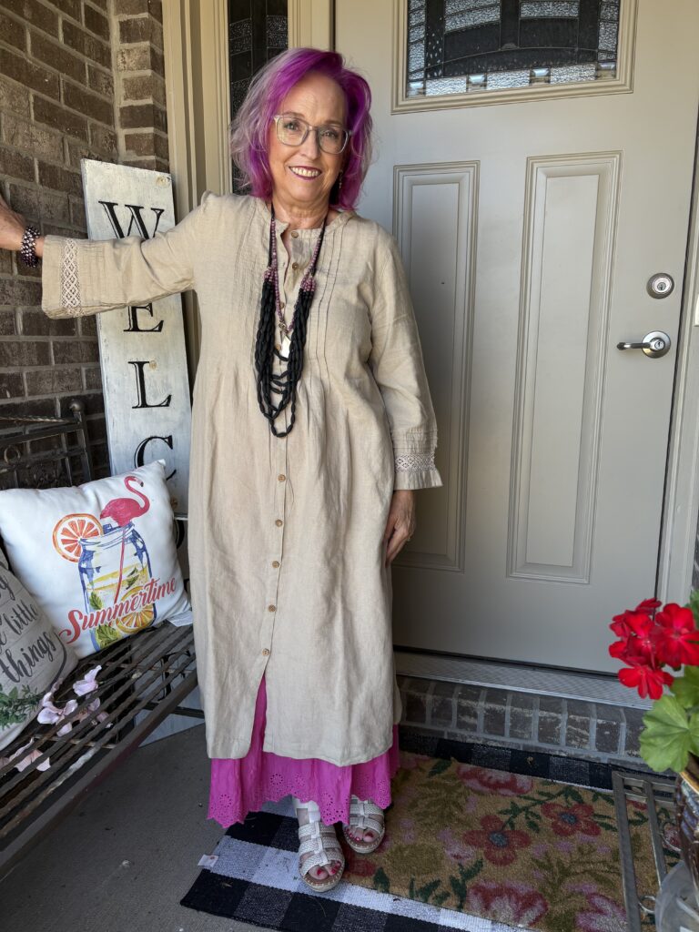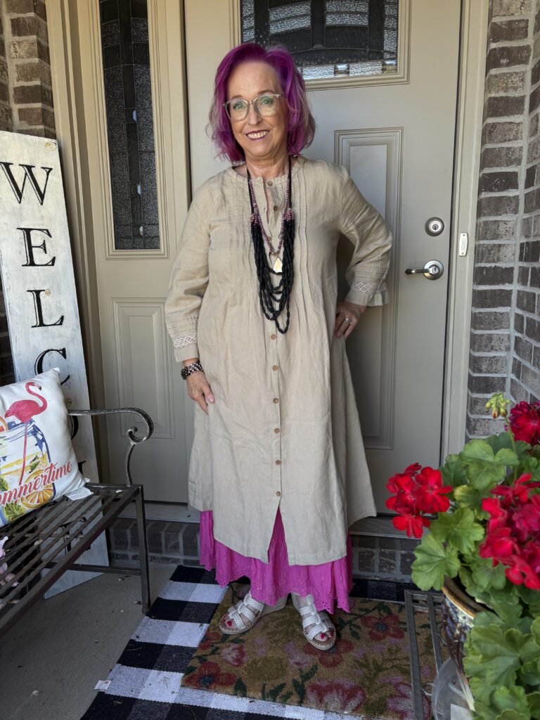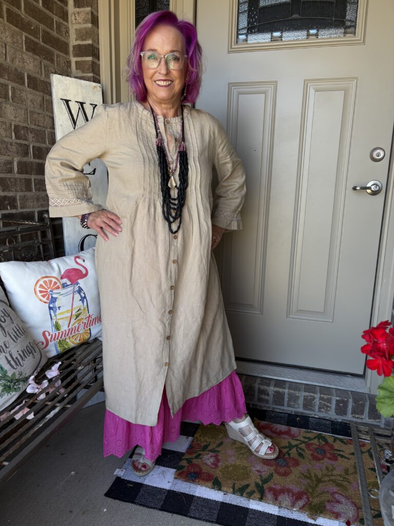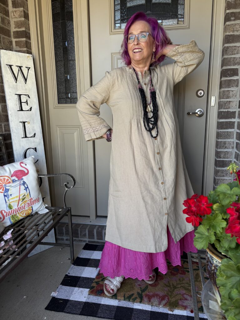 You may have noticed something new! Yes, I got a new dress from Gudrun Sjödén. Nah…well, I did get a new dress, but my hair stylist added these merlot, purple, and hot pink colors in my hair. She also added a lavender (I think) glaze on the part that wasn’t colored. These are fashion colors which will gradually fade away. The downside to these is I have to wash (or condition) my hair in icy cold water. This is the Sand dress from Gudrun Sjödén. The name is rather appropriate, isn’t it? It’s actually called Dark Natural. I added a pink slip to bookend my look!
