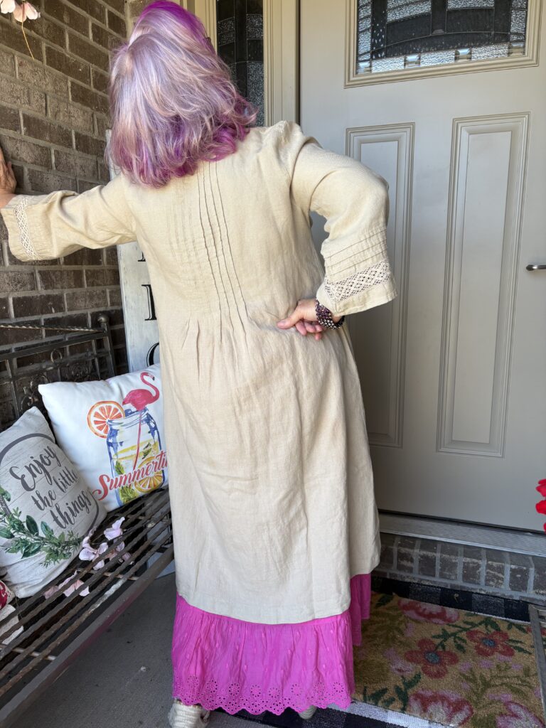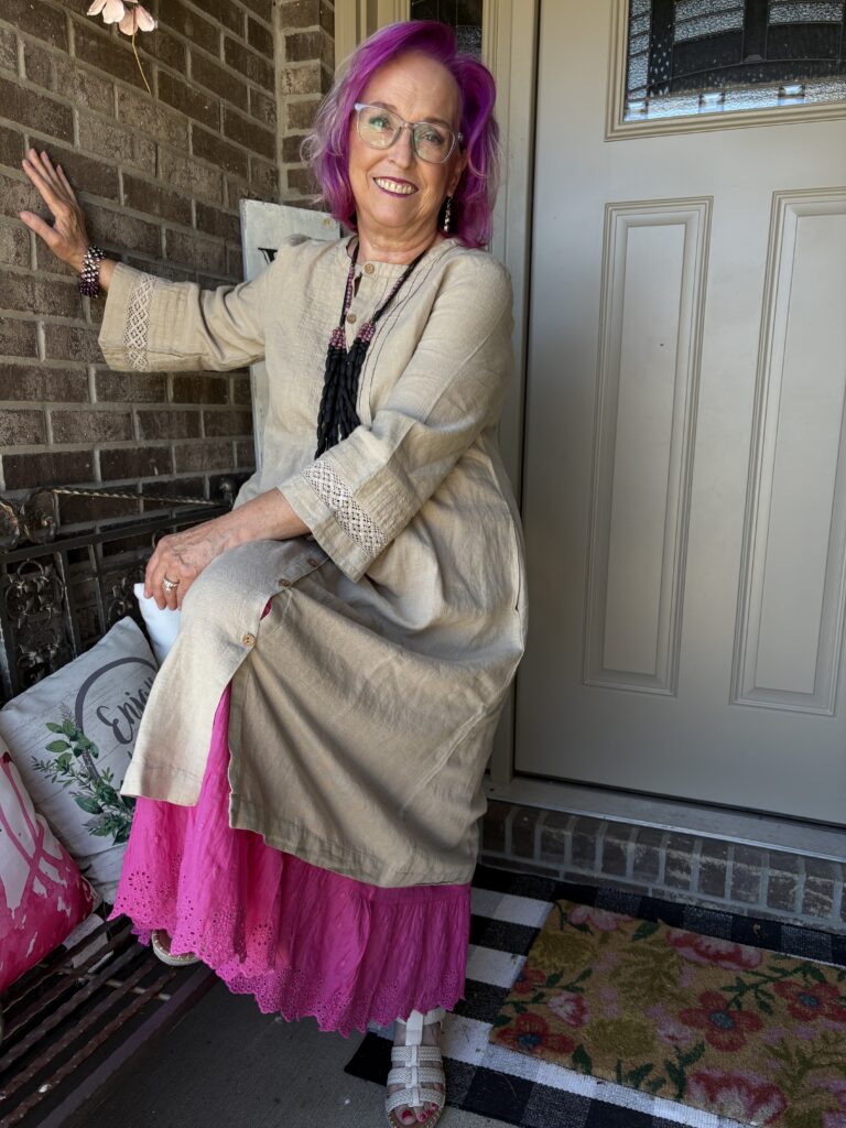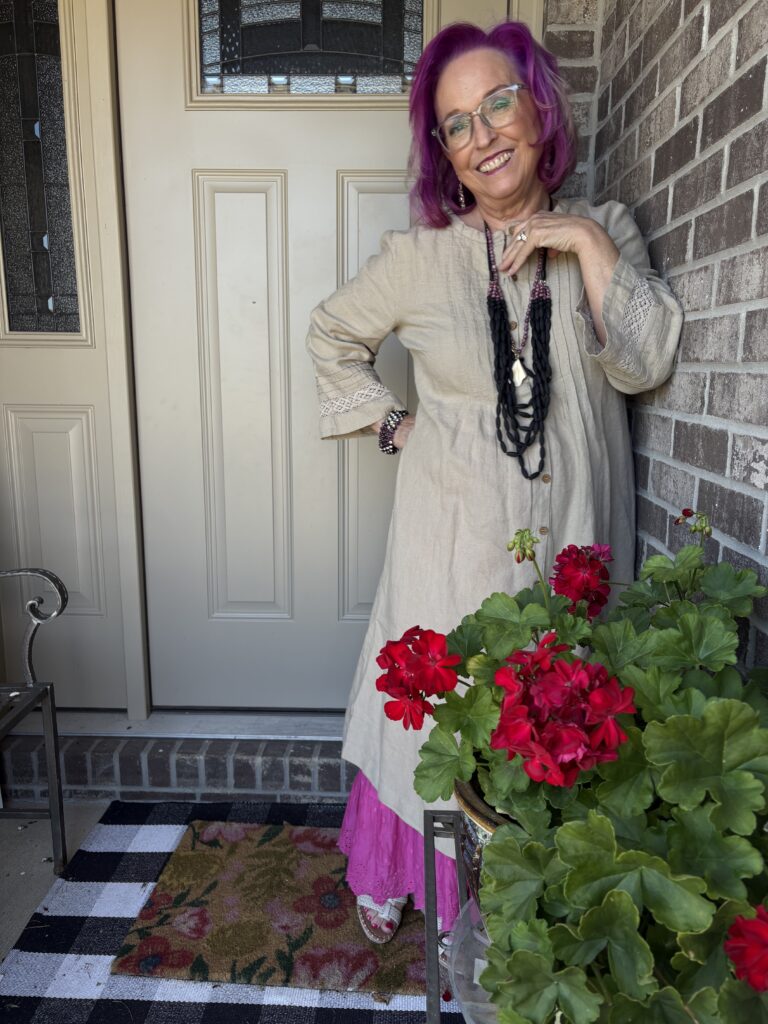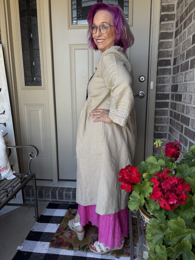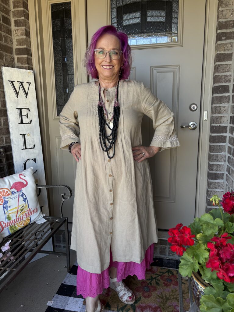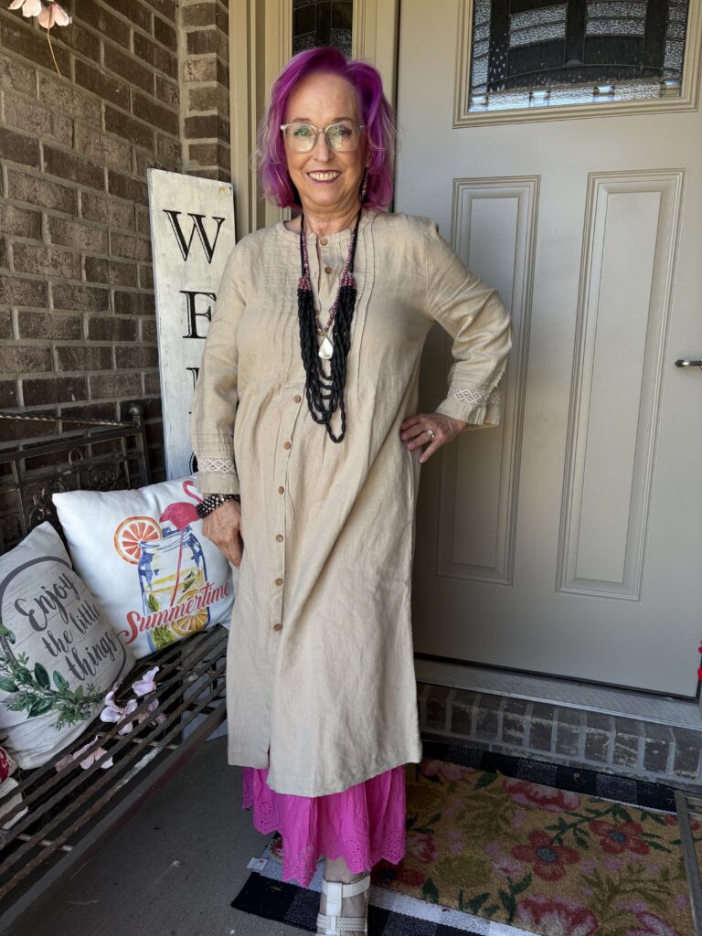 You may have noticed something new! Yes, I got a new dress from Gudrun Sjödén. Nah…well, I did get a new dress, but my hair stylist added these merlot, purple, and hot pink colors in my hair. She also added a lavender (I think) glaze on the part that wasn’t colored. These are fashion colors which will gradually fade away. The downside to these is I have to wash (or condition) my hair in icy cold water. This is the Sand dress from Gudrun Sjödén. The name is rather appropriate, isn’t it? It’s actually called Dark Natural. I added a pink slip to bookend my look!