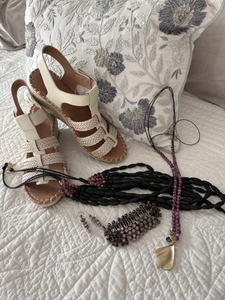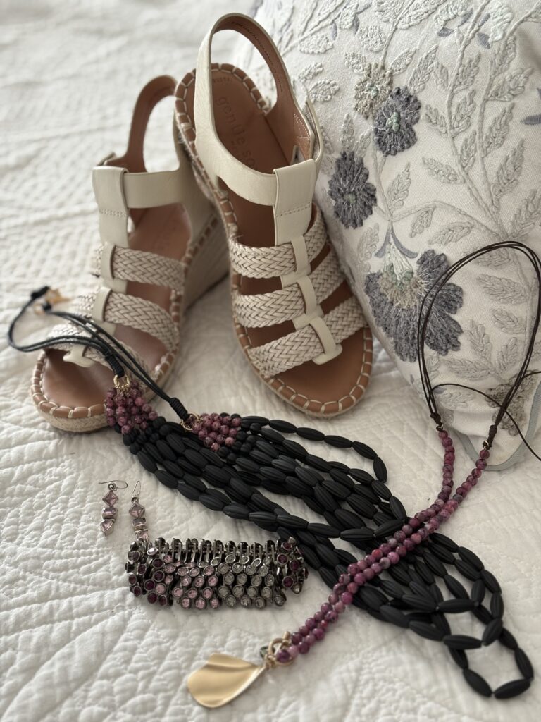 These Gentle Souls Caplin espadrilles are just so comfortable, but they aren’t available in this color any longer. I really like wearing a wedge like this because they give me height plus they’re easy on my arches. The jewelry is very old. The bracelet is from Loft back when it was called Ann Taylor Loft. The elastic is actually a bit stretched out so I was afraid it would pop as I was putting in on or taking it off. The earrings are from…you guessed it…eBay! The two necklaces are from J Jill. I always seem to wear them together.