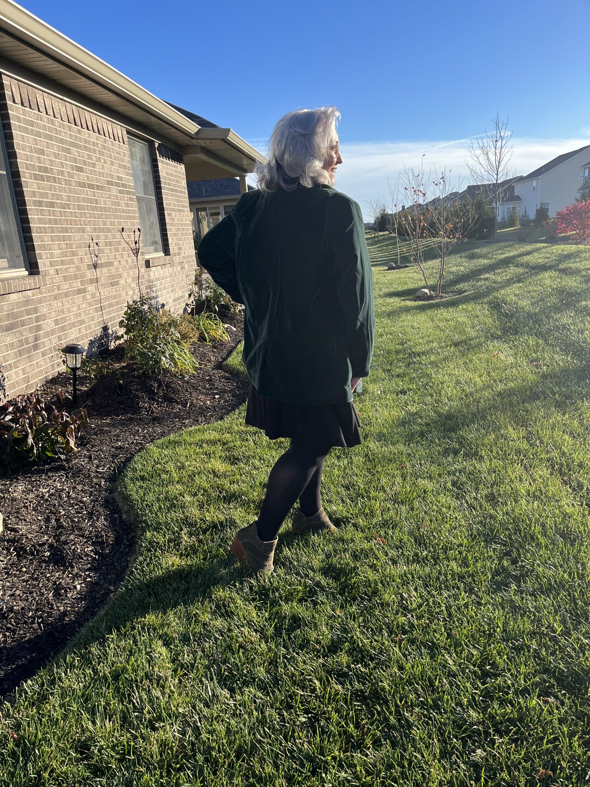 You look amazing in these pictures. If you ever thought you might have lost some sparkle, you’ve definitely found it again. Your hair is just beautiful. And I love all the ways you paired this blazer to create different outfits. The black dress look is perfect for parties. But how cute the blazer looks with the striped dress. And those green booties. OH MY GRAVY. They are an unusual color of green…kind of sage. But not. Whatever the color, they are sensational. Enjoyed seeing you in the backyard with your still green grass. I guess it hasn’t been really cold there yet, either. Enjoy your Thanksgiving, beautiful YOU!!