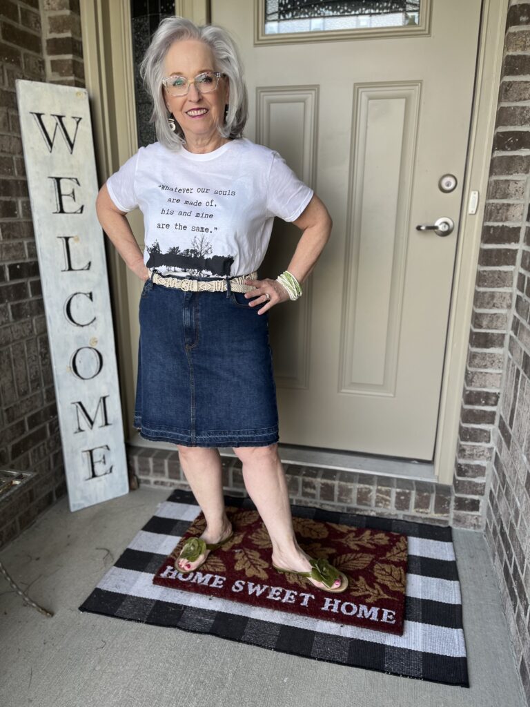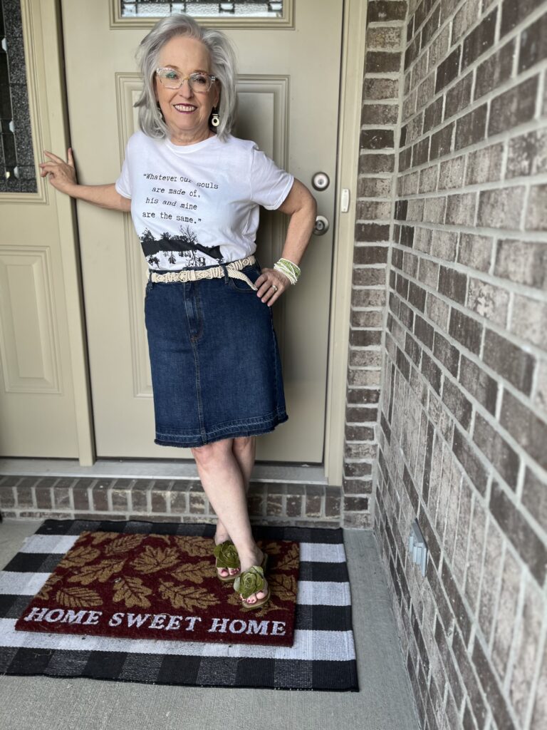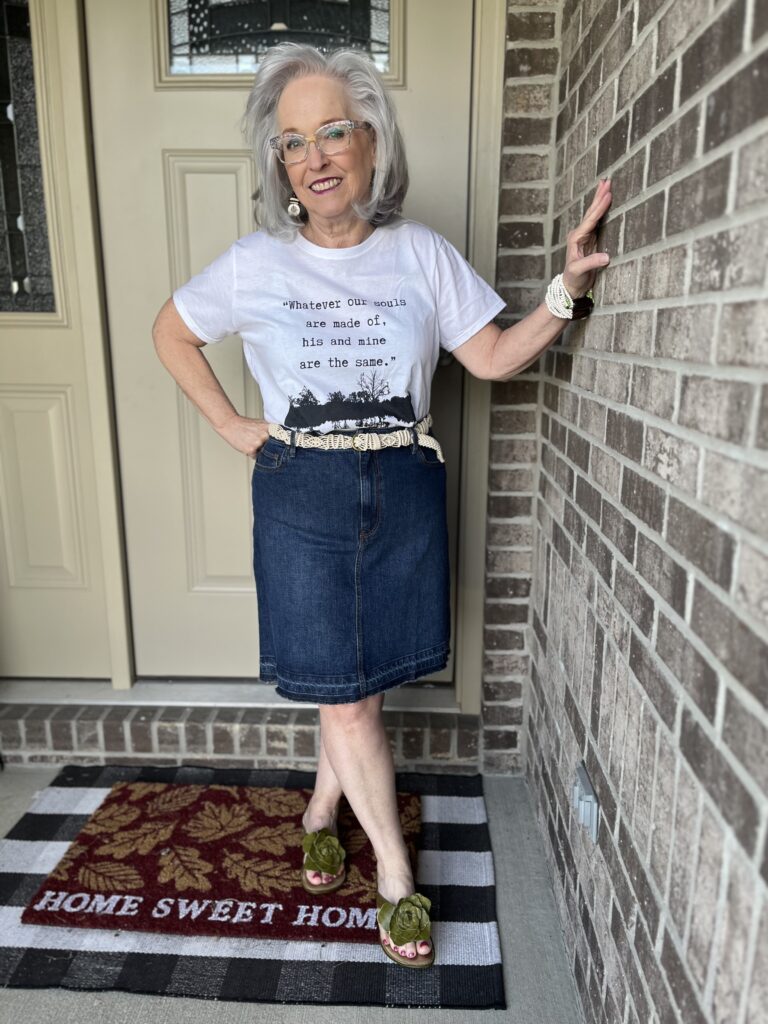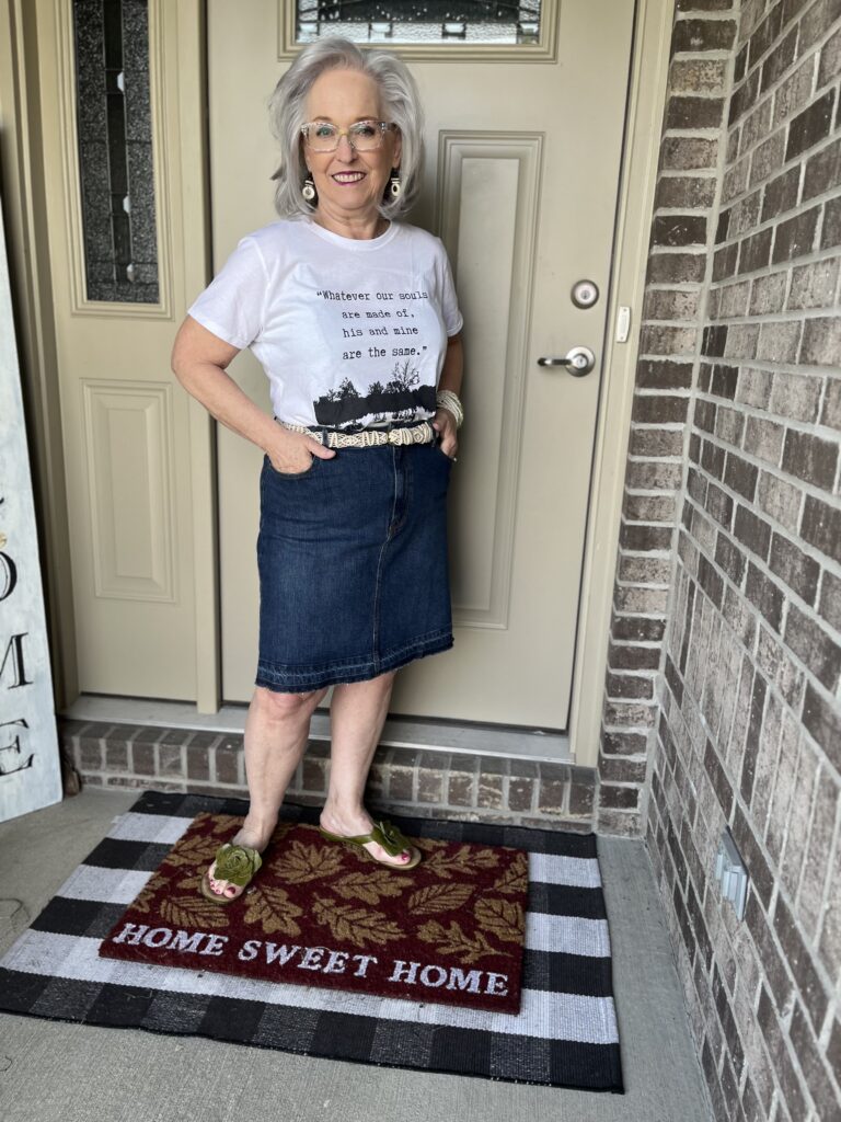 5. I love that quote on your graphic tee! I don’t own too many because I always struggle feeling comfortable in them. I hate drawing attention to my chest but I think a graphic tee is so cool! Your skirt is the perfect length and wash – a classic!