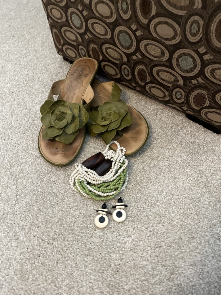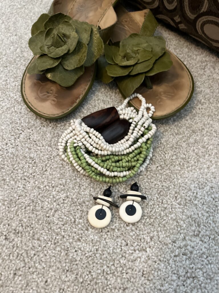 These are one pair of my old Born sandals. I also have them in mustard and black. There’s a new iteration of them (here), but I’m not sure they’re what I want (not that I really want any). The bracelets are from the Newfields gift shop. They’re a little loose so I twisted them together as best I could, but that big wooden bead kept them separated. These are the Assuta White Drop earrings from Sylca Designs. I discovered this brand at the Newfields gift shop, too! If you don’t like this color combination, there are eight others!