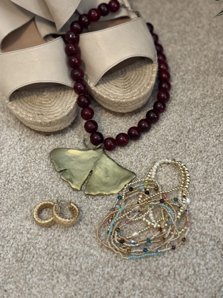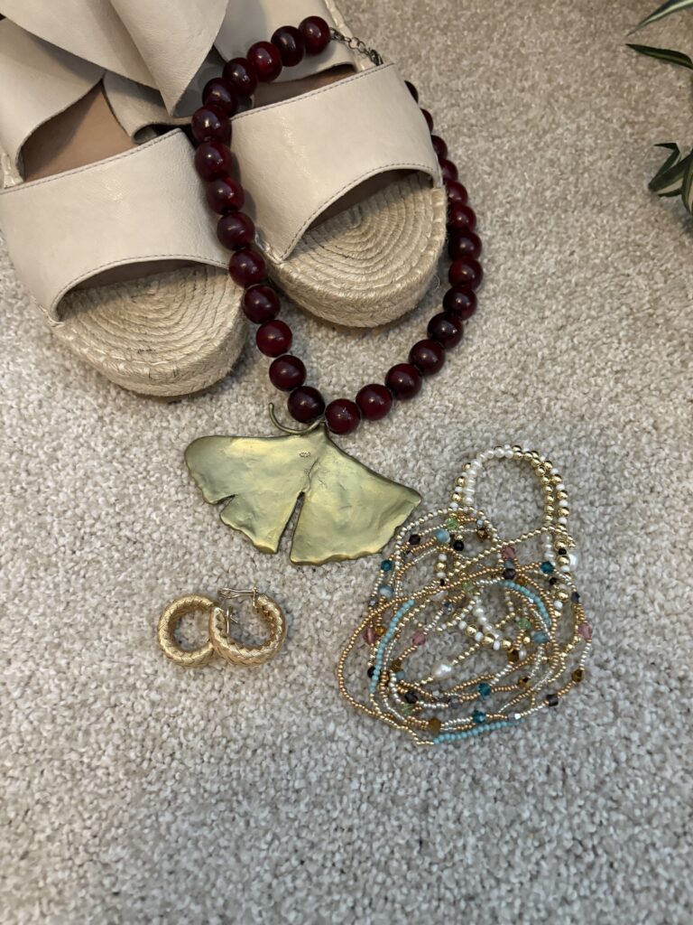 Yes, I know. Here are my Willow sandals again. They just seem to work with everything, especially when I’m going to be walking and standing on my feel for a long time. The earrings were a Christmas gift from Nigel many, many years ago. The bracelets are from the “I have no idea” store. But, let’s talk about this necklace! I bought it at the museum gift shop. I’d been eyeing this gingko jewelry for a long, long time. But, I’d never seen this really large one. One week, they were doing a double discount, so I bought it right up. It bothers me I don’t have gingko earrings now!