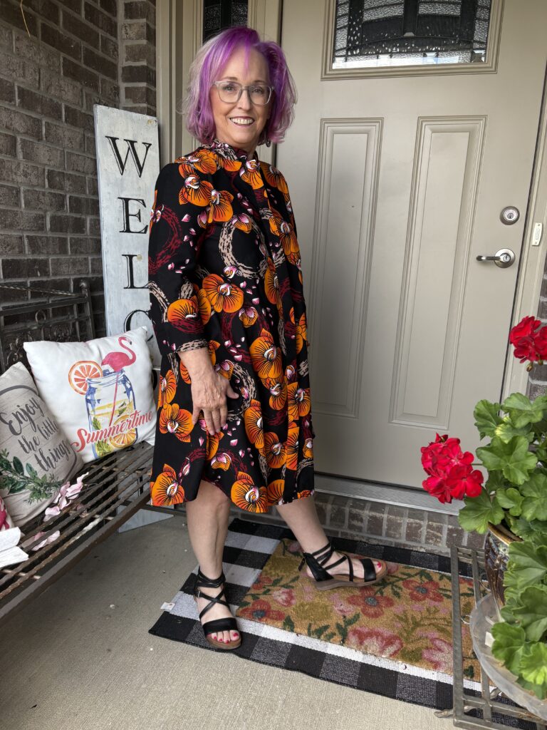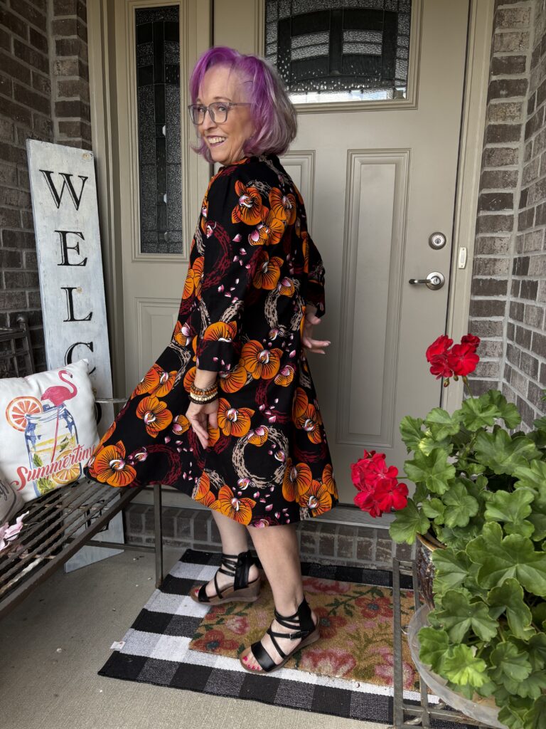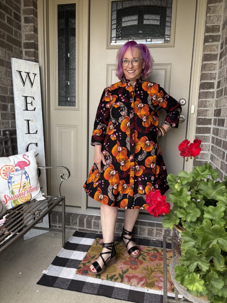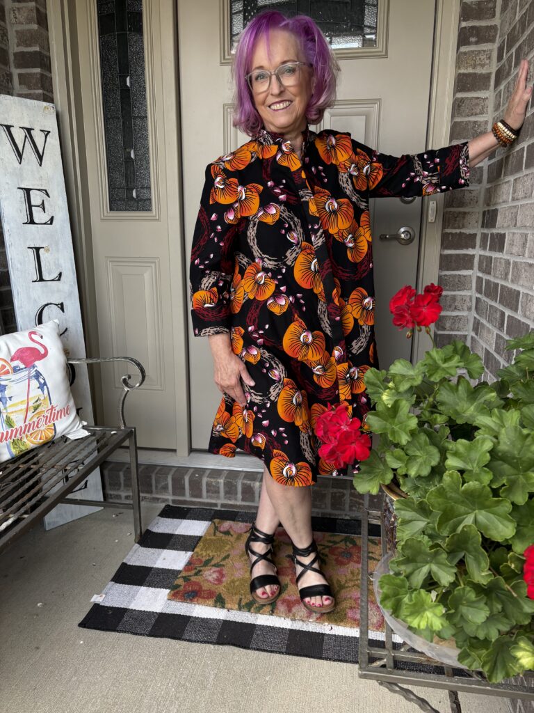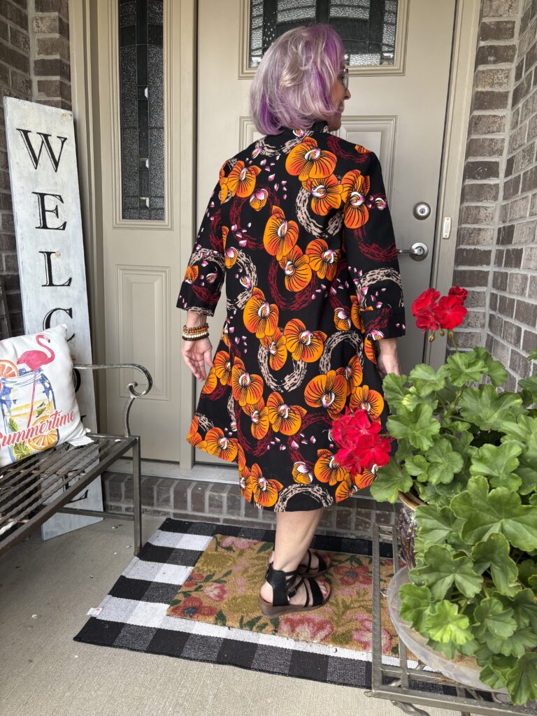 This is an example of being Daenabled! Yes, it’s a new word I’ve come up. It’s definition is to be enabled by the beautiful Daenel. She often wears Zuri dresses and just inspires me to indulge myself. Well, over Labor Day, everyone was having sales. That included Zuri. The hardest part about buying a dress here is picking out a pattern. Luckily, they give you the “notes” of the dress, much like you see when perfumes are described. This is the Orchidea dress. And, here are the “Color notes: Black, yellow, orange, red, beige, pink and white.” I thought it was perfect for “Colors of Fall!” These are a very good substantial cotton. I do wash and iron them so that any excess dye is removed as well as to soften them. They just get softer and softer the more you wear them.