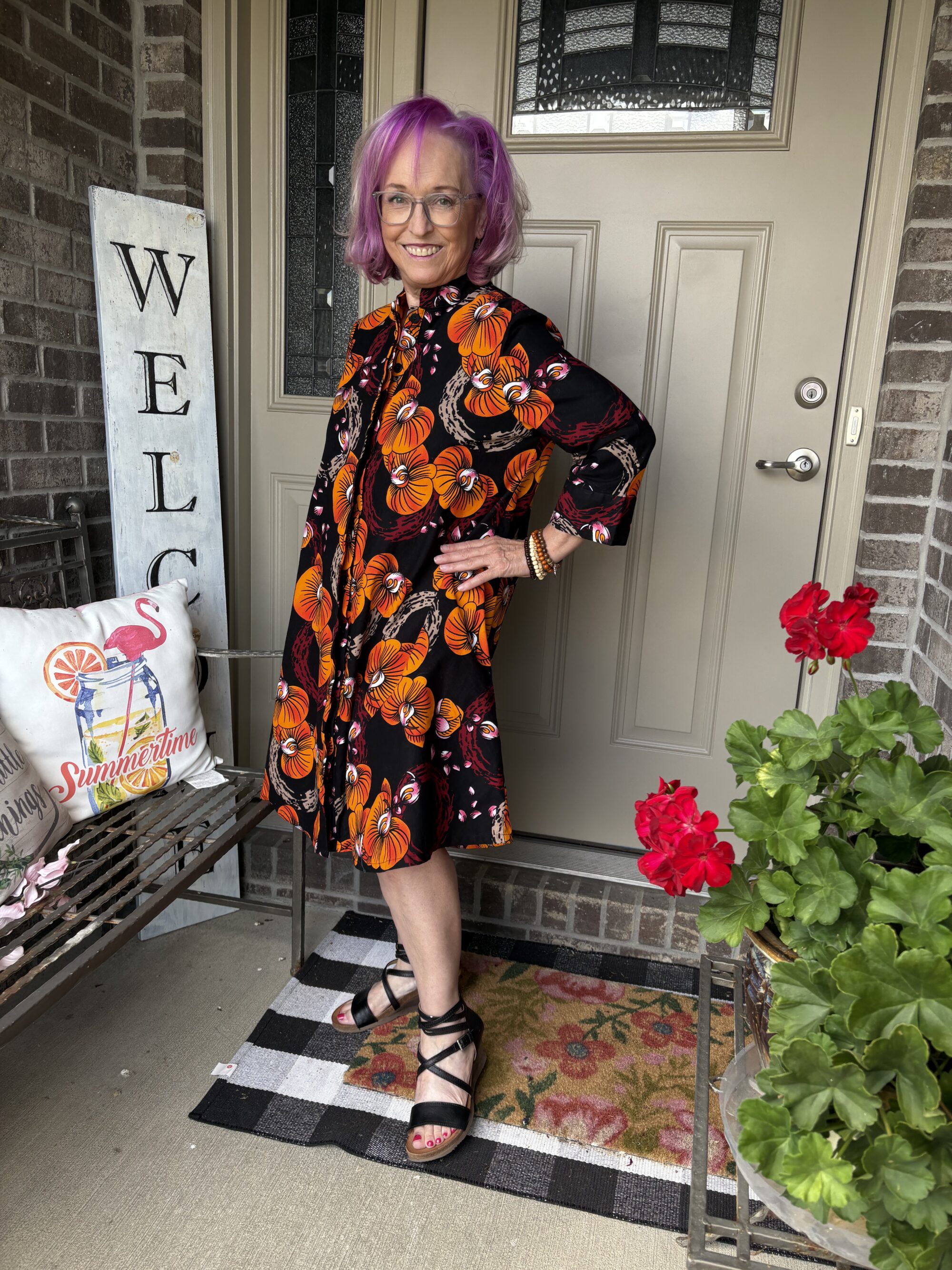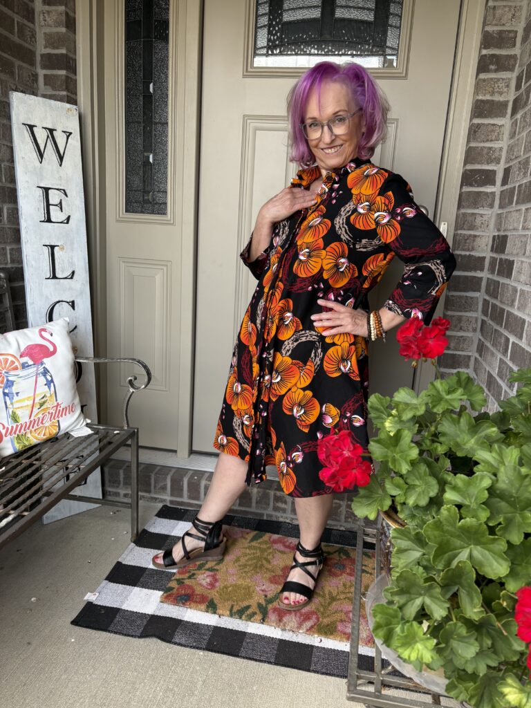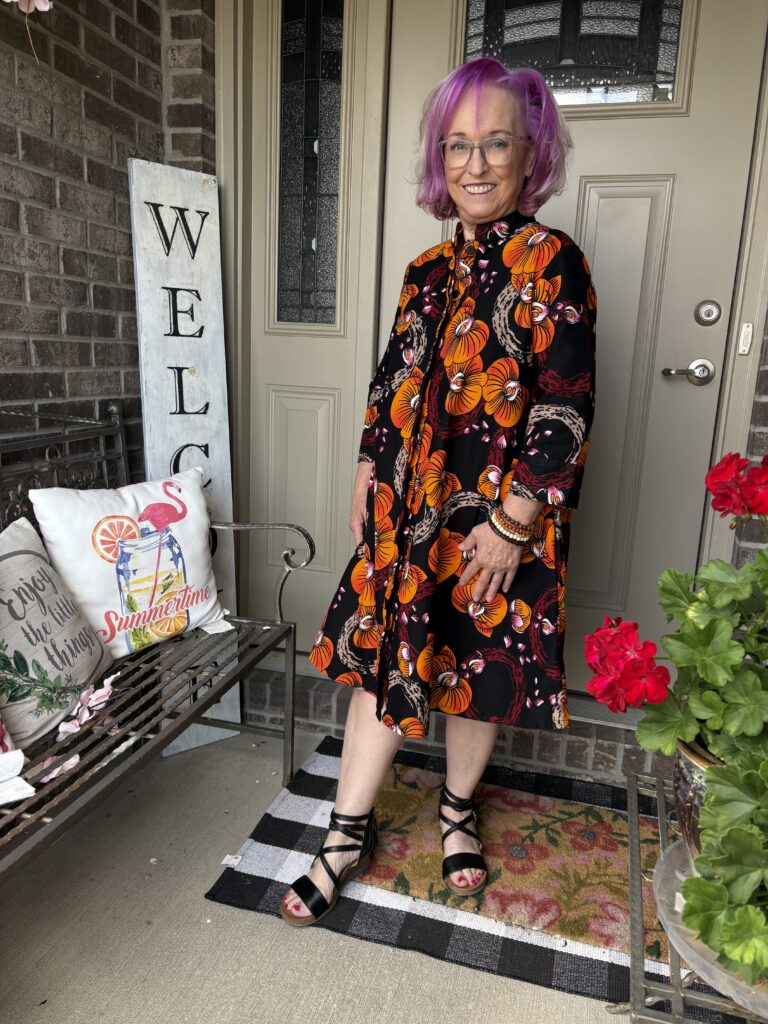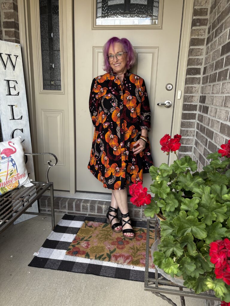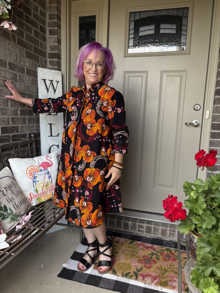 This is an example of being Daenabled! Yes, it’s a new word I’ve come up. It’s definition is to be enabled by the beautiful Daenel. She often wears Zuri dresses and just inspires me to indulge myself. Well, over Labor Day, everyone was having sales. That included Zuri. The hardest part about buying a dress here is picking out a pattern. Luckily, they give you the “notes” of the dress, much like you see when perfumes are described. This is the Orchidea dress. And, here are the “Color notes: Black, yellow, orange, red, beige, pink and white.” I thought it was perfect for “Colors of Fall!” These are a very good substantial cotton. I do wash and iron them so that any excess dye is removed as well as to soften them. They just get softer and softer the more you wear them.