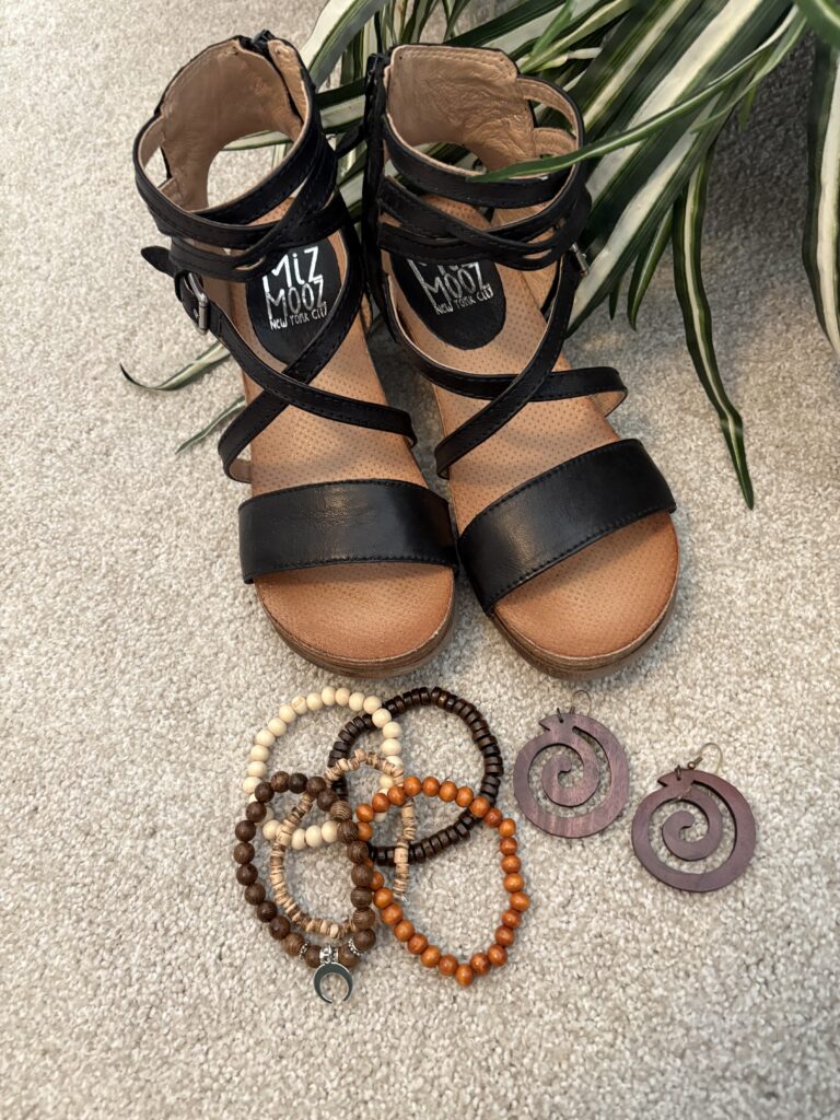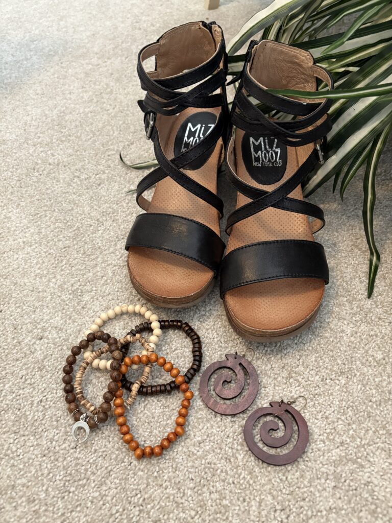 Now, I know the fashion pundits say you shouldn’t wear anything that cuts you off at your ankles. And, to an extent, they’re right. I know those ankle straps really do cut you off where you could be “lengthening” the appearance of your legs. But, I happen to love these Shay sandals by Miz Mooz. I have worn them for hours at the museum, walking the galleries as well as standing while listen to docents. And, they are comfortable, my friends! Are they pricey? Yes, yes, they are. But, at my age, I have learned comfort ant quality are worth the price. Perhaps, I offset that price by my Target earrings whose age can be measured in decades as well as my wooden stretch bracelets that were extremely inexpensive!