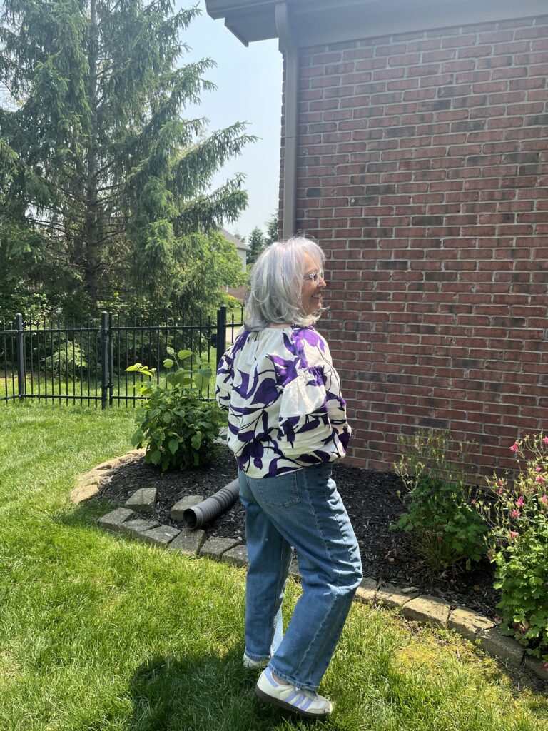 Now, I have been caught out by statement sleeves before (see this post). I could never ever get that top to work for me. I loved everything about that top…the pintucking, the color, even the fabric. But, there was so much fabric to the top itself. A good wind and everyone could see what the good Lord gave me up top! You couldn’t tuck it in because, as I recall, it was a tad on the short side and wouldn’t stay tucked. I did try wearing it open, and it lost a lot of its panache. But, this Linen Peasant top? This one is sticking around. I love the color, the pattern, the fabric (100% linen), and the sleeves! Look at those sleeves! Once again, it’s pintucked, but the sleeves are, not the top itself. It’s cropped though it’s not described that way. As you can see, it’s not all that long on my 5’1″ body. The body is a little oversized, but not by much. I’m wearing my barrel jeans from Old Navy. I am so glad I tried these on in the store one day because I just love them! I think I may get them in a different wash and use some rewards.