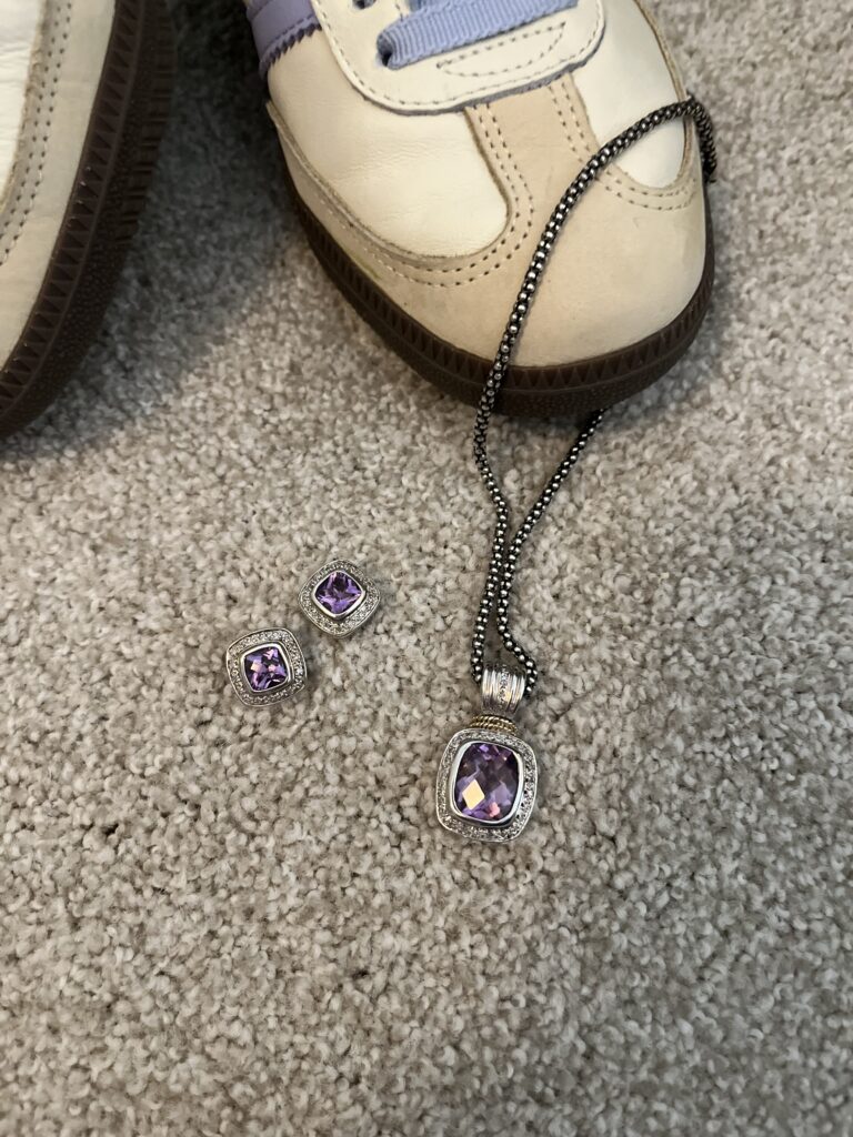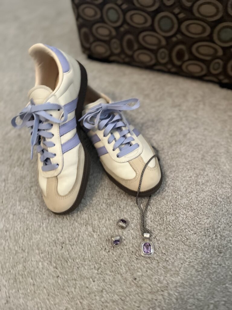 This jewelry is very old. I’m talking in terms of decades! I think this was Macy’s version of David Yurman. I don’t think there’s much of a difference, do you? I do know, considering the cost of David Yurman, they were a bargain. I love amethyst jewelry, but I don’t really like the Yurman Albion ring in amethyst. Here are these sneakers again! They are the adidas Samba OG sneakers in cream white/violet/sand. I am seriously considering getting another pair, but I don’t know what color combination to get. Maybe, I should wait to see what colors come out for fall.