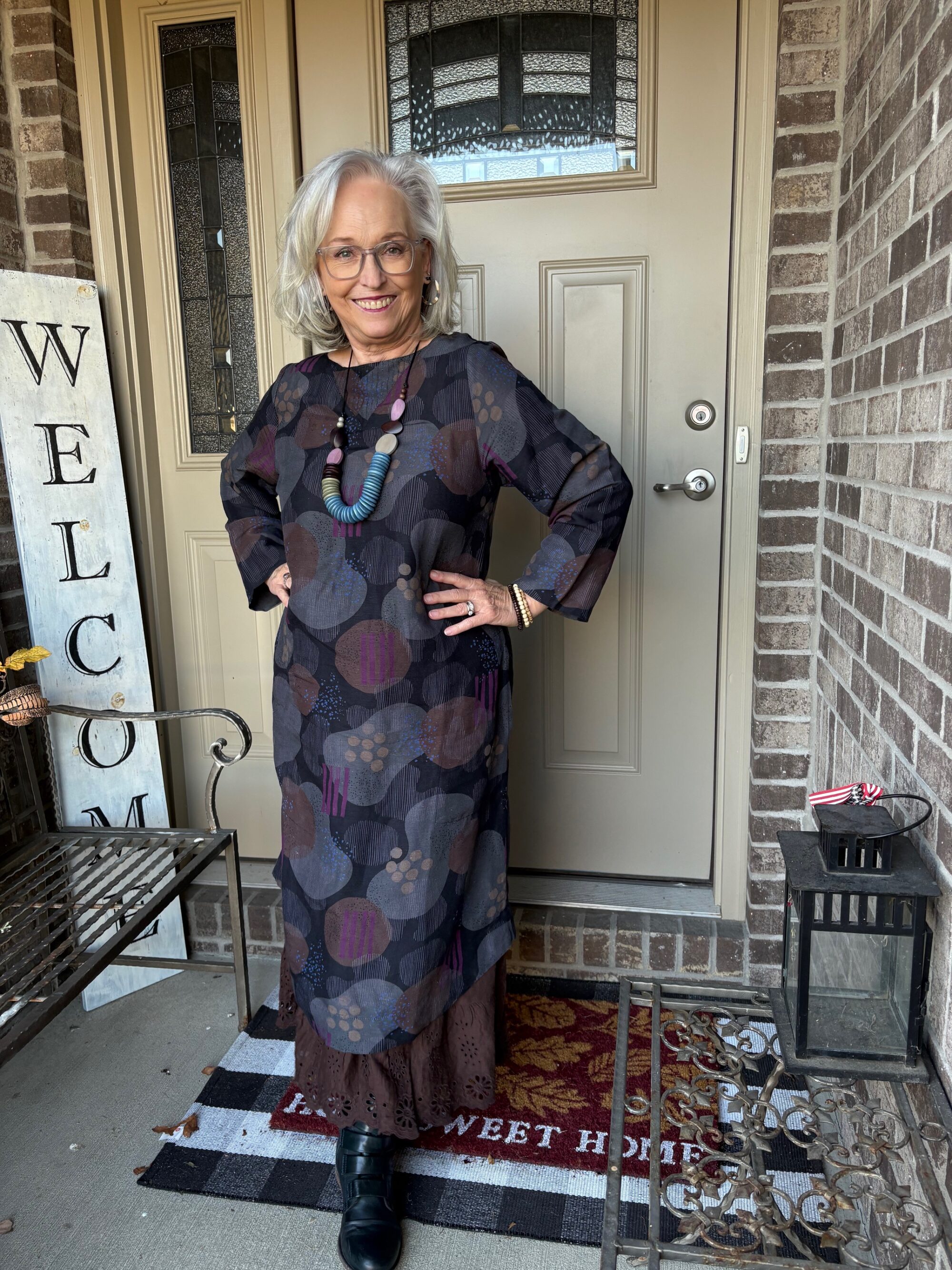 You’re probably wondering what’s happened to all my other boots, right? Well, these Miz Mooz Leighton boots are so comfortable that I reach for them over and over, especially if I’m going to the museum. I really like the Ocean color because they read as almost black but yet you can tell there’s some blue there. I added this beautiful Sylca Cream Mixed Media Necklace. I bought mine at the museum gift shop, but it’s also on their website (no affiliates here). Then, I added the multi-colored hoops along with three wooden bead bracelets to kinda go with the necklace.
