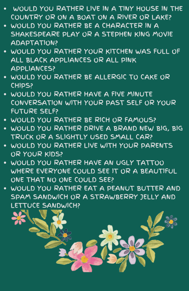 I really liked what I did last year, but who wants a repeat, right? Last year, we wrote about things we “can” or “may” do in the month of May. This go round, we’re back to everyone’s favorite! Would you rathers! I tried really hard to come up with my own, but I had to resort to google for a few of them. Anyway, I hope you’ll play along! WordPress has been a bit of a pain as has my email sender-outer. I recently found out some of you aren’t getting emails saying there’s a new post. That’s happening to me, too, but I thought it was only people using Blogger. Apparently, it’s across the board. So, if you’re not seeing posts from blogs you follow, you might check to see if they have a new post up! I don’t really know how to handle this problem, but I’m looking into it.