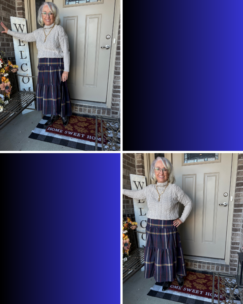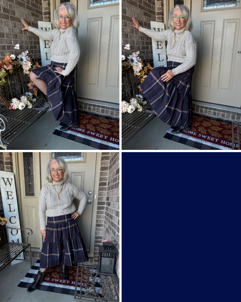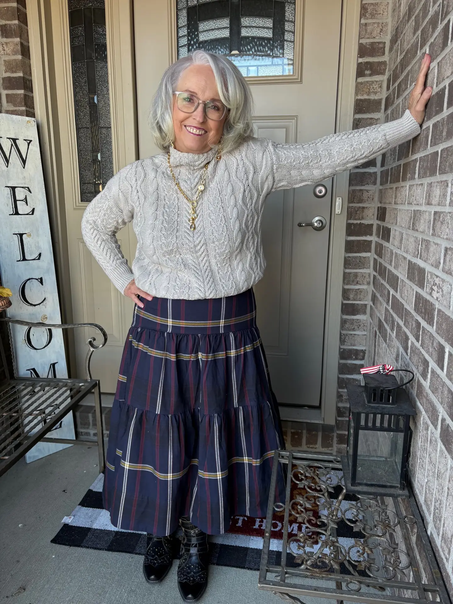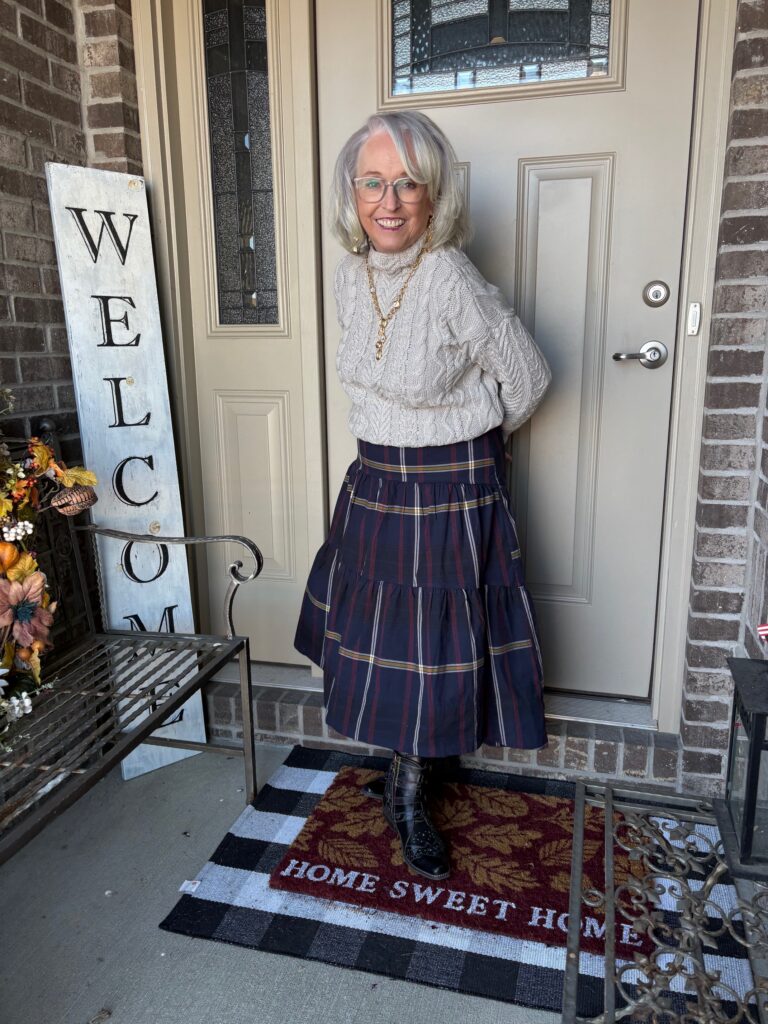 But, I really want to talk about this skirt! It’s from Banana Republic, and, friends, I stalked that website for this skirt! It was there in small (like 0-4) sizes, and then it would disappear for a couple of days. Finally, it was there, and in my size! I was thrilled when I opened the box to discover this beauty. It’s a nice heavy cotton. But, the one thing that really bugs me is how the plaid doesn’t line up. I think it would have taken a lot of time, effort, and probably “lost” fabric to do so. As you can probably tell this is a tiered skirt. So, to match the plaids, there would have been so much finagling that the skirt would have been even more expensive than it already was. Luckily, I got it during their recent 40% off sale. It hasn’t been on the website for days, but right this very minute, as I’m typing, it’s there! It’s called…wait for it…Tiered Midi Skirt! Of course, the sale is off now, too. The other downside is there are no pockets. I do love pockets because my hands are just so awkward…silly little boogers! They need a pocket to crawl into when they’re not holding something!