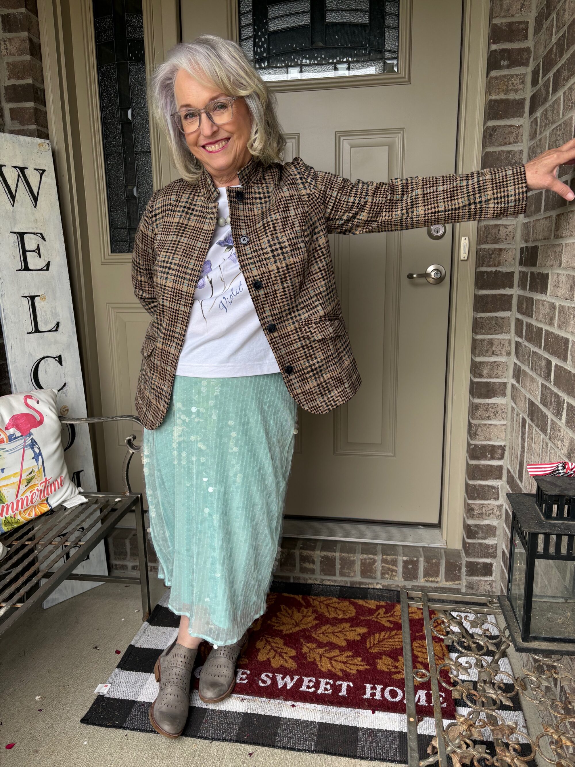 Yeah, I’m not a fan of this skirt (from how it looks on y’all) either, but I am just not a sequin person in general (too easily damaged/high maintenance). That said, the basic idea of the plaid blazer + graphic T + skirt outfit was brilliant, and I do like the T and blazer together. I’d wear a different style of skirt and add the sparkle and shine with jewelry.