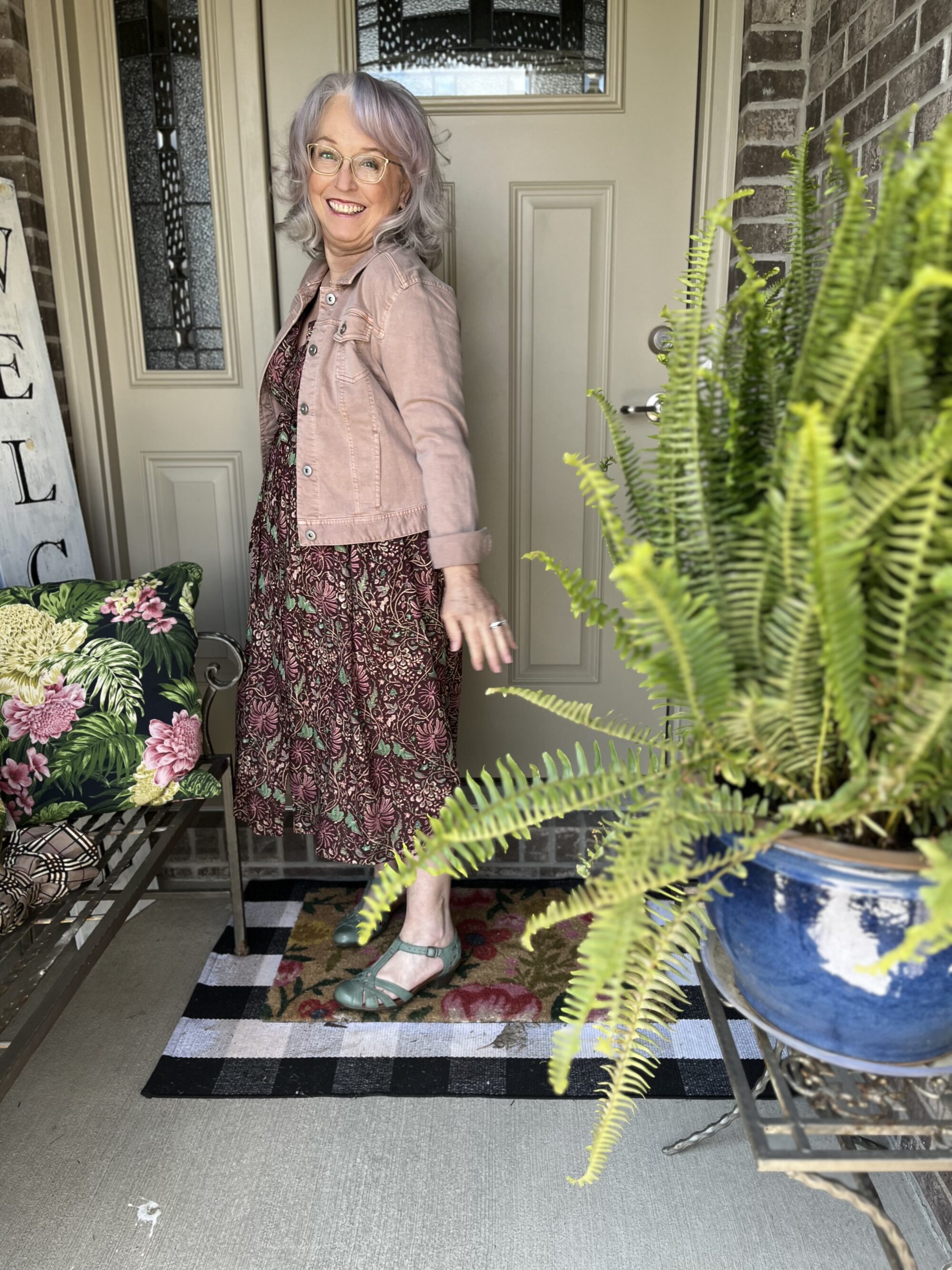Unfortunately, the store in Asheville didn’t have a medium in this sundress. But, sundresses can always be worn loose, right? The dress is a skosh big. I need to move some buttons on the bodice to make the sweetheart neckline a bit more noticeable. It’s also 100% cotton so I could probably shrink it if necessary. Today, I decided to go with a denim jacket from J Jill in a pink color I can wear. I also did something a little different with the dress. I love that April designs dresses with button on ties. Today, I decided to tie it in front of the dress. This created some really nice pleating and gave the dress some shaping. It also got rid of some extra floof in the behind! I like how versatile this dress is. I can wear it with a jacket or even the Jane Cropped sweater from this post. It buttons all the way down so I could even wear it open over another dress, jeans, or leggings. There are so many options! By the way, this is not a review so I’m not including the pertinent details I wrote about in Tuesday’s post! But, I do highly recommend this dress. The print really is gorgeous!