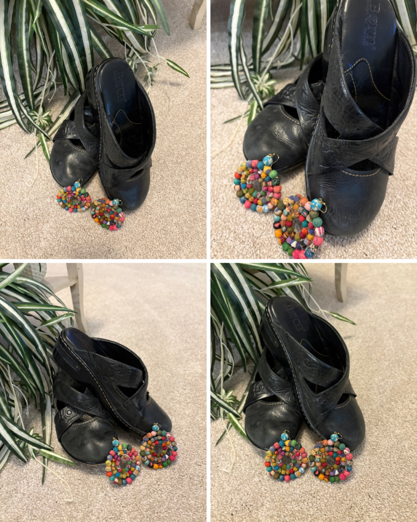 I definitely wouldn’t have worn clogs to Cedar Point. In fact, I’m not sure what I did wear. I’m sure they were some flat sandals. But, for today’s look, I’m wearing my trusty “milk maid” clogs from Born. These are going on 16 years old and are just as much fun as the clogs I had in the 70s! I added a pair of kantha statement earrings from World Finds, but I can’t find them on their website. If you like them, just check back often. They frequently do restocks. On my honeymoon, I would have worn this ingenious pair of gold hoops my mom had bought me. They were the same size as a post all the way around. One end fit into the other, making a hoop. Over time, they warped, and they would twang when they came undone. At first, I’d always jump at the boing they’d make. But, then I got used to it. As with other things, I wonder what happened to them. I wore them almost all the time.