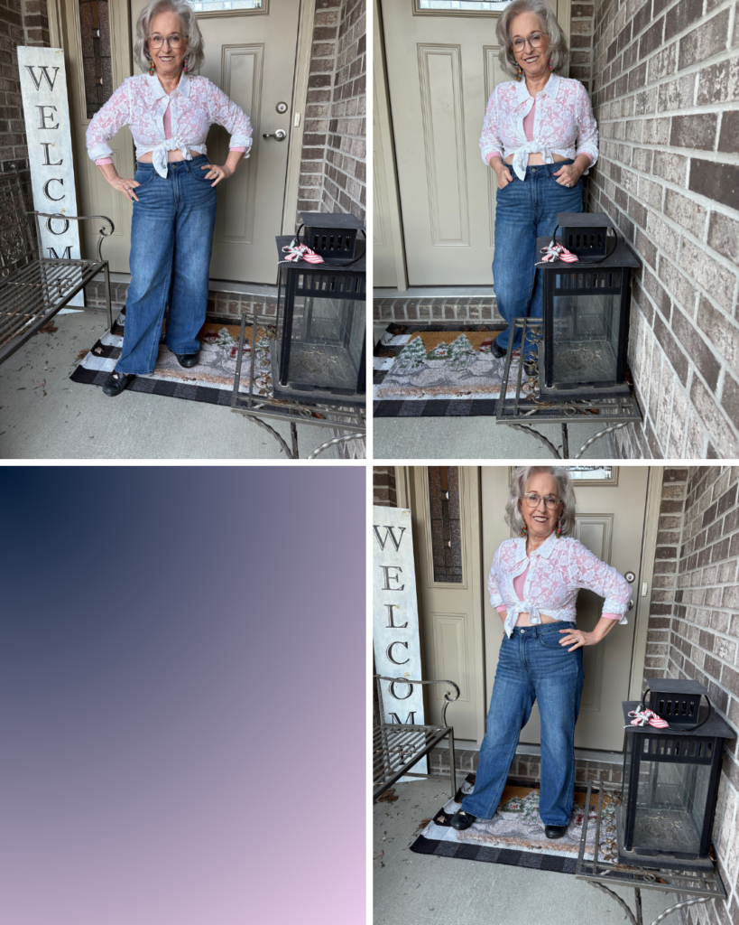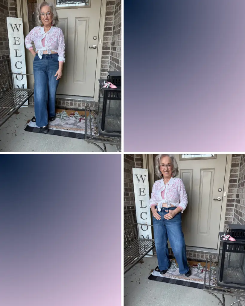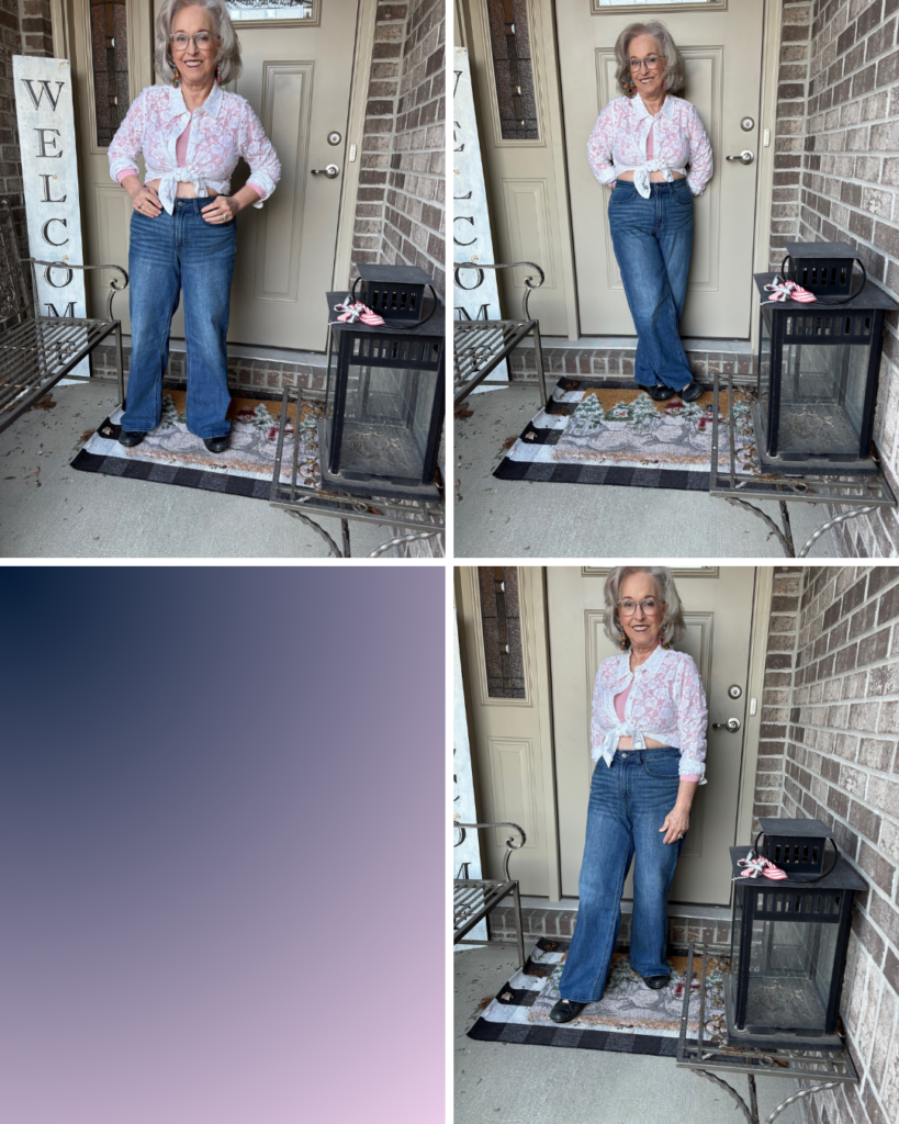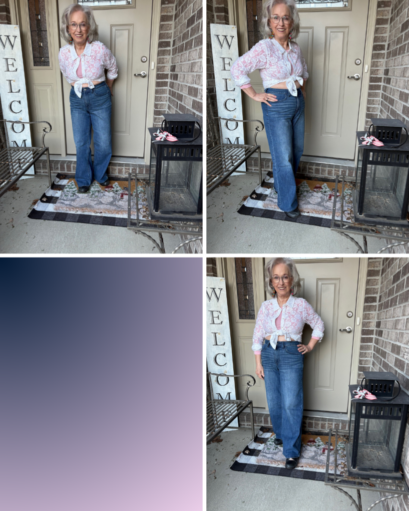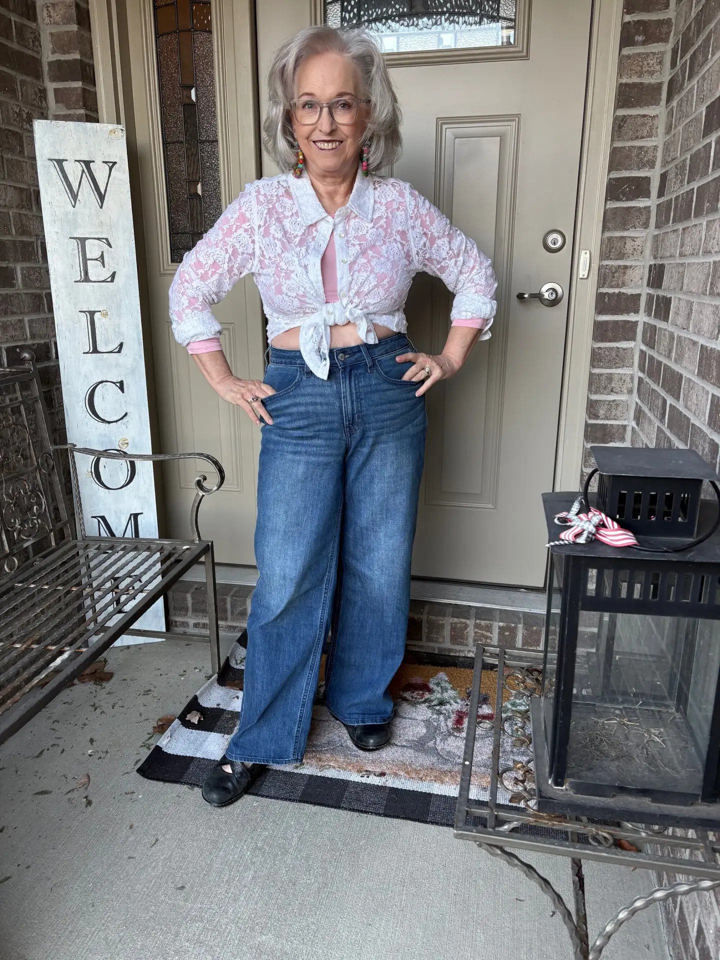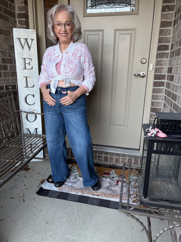 Well, this wasn’t the most creative interpretation I’ve ever done. I considered wearing something I would have worn when the song came out. But, honestly, I couldn’t remember what that was. It was the year I graduated from high school and got married. I suppose I could have tried my wedding dress, but I highly doubt it fits! And, it’s a bit on the fragile side. but, since the song came out in 1976, the year I got married, I decided to wear something similar to what I would have worn then. I would have worn high waisted bell bottoms…really huge bells bottoms. Today, I’m wearing high waisted wide leg jeans from Old Navy. I obviously couldn’t recall many exact outfits, and the ones I could remember, I don’t have anything nearly close to that. So, I went with what I wore on our honeymoon. Nigel and I had brand new jobs and could only take one day off. We went to Cedar Point, an amusement park! I wore jeans, a tube top, and a gauze short sleeved top. Today, I’m wearing a pink 3/4 Halftee (gifted) which is as close as I get to a tube top these days! Just a reminder, you can use my code, MARSHA2098, for 20% off your order. Over the top, I wore my trusty April Cornell lace blouse. I knotted it at the top, and yes, that’s my stomach you see. You would have seen it in 1976 so you’re seeing it in 2026!