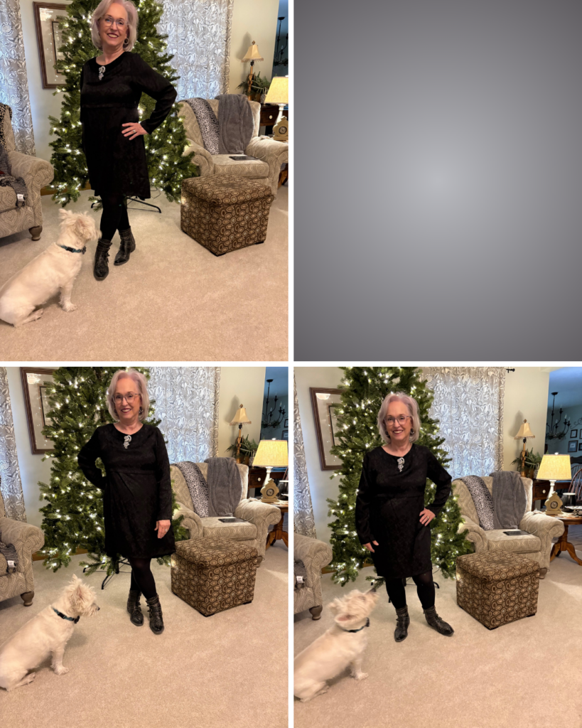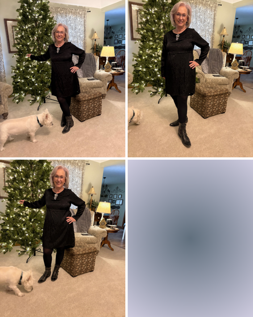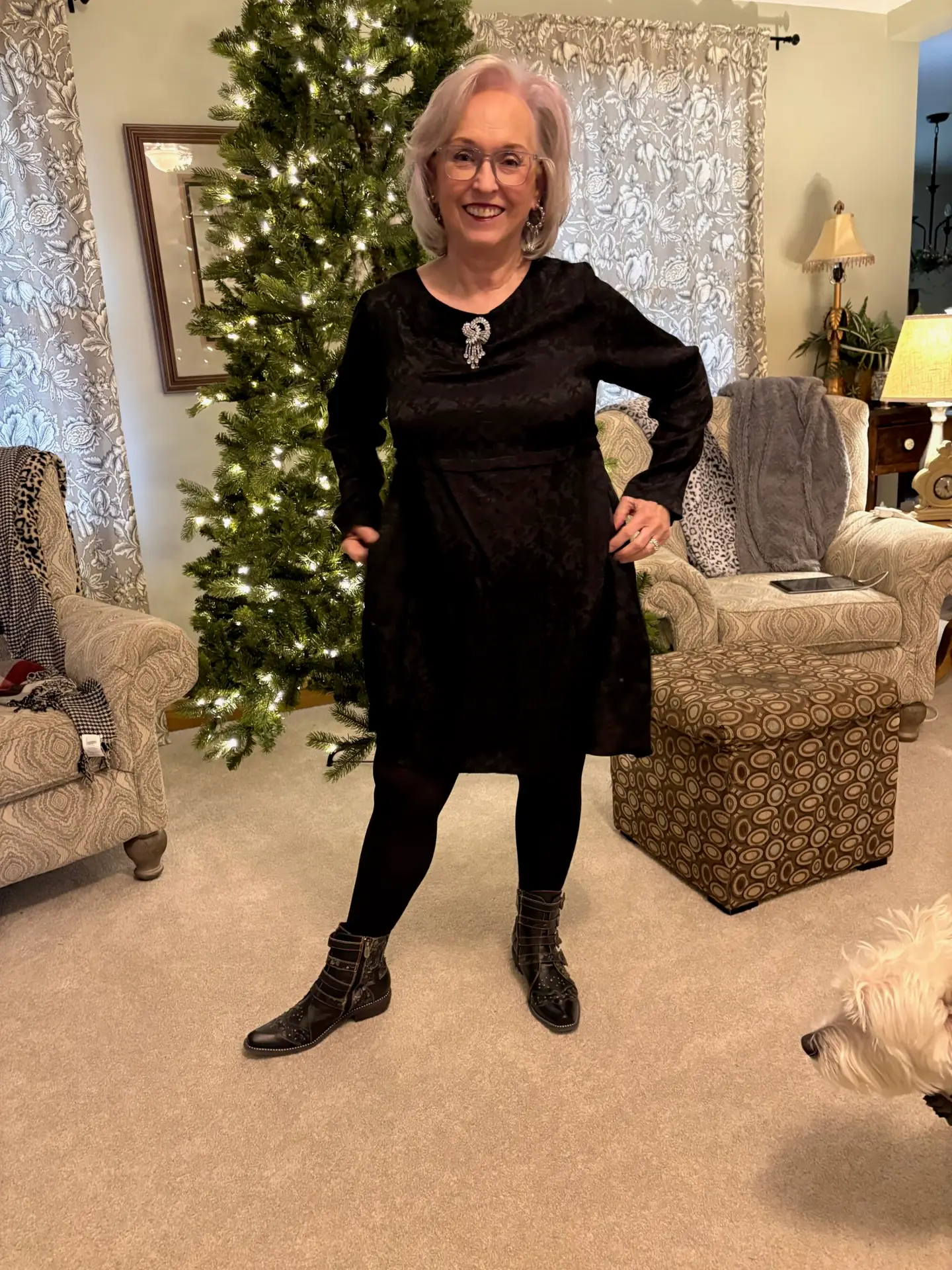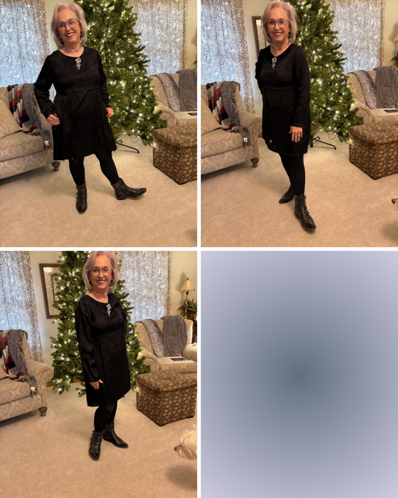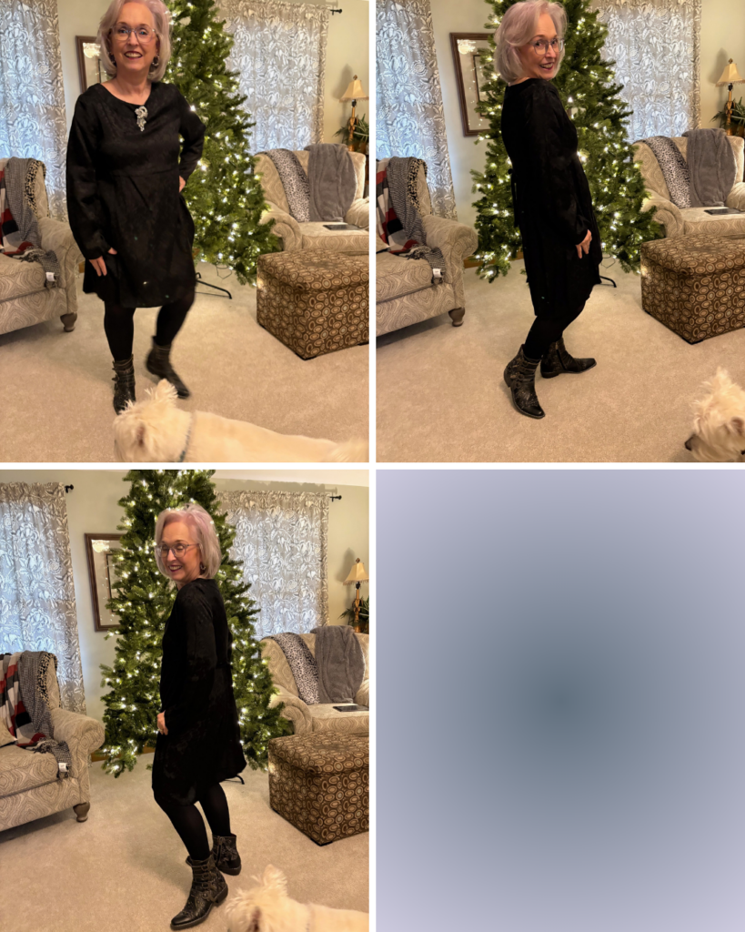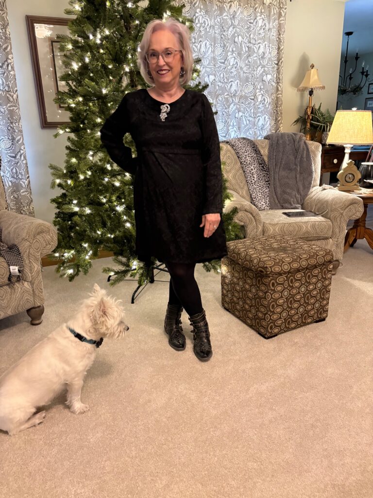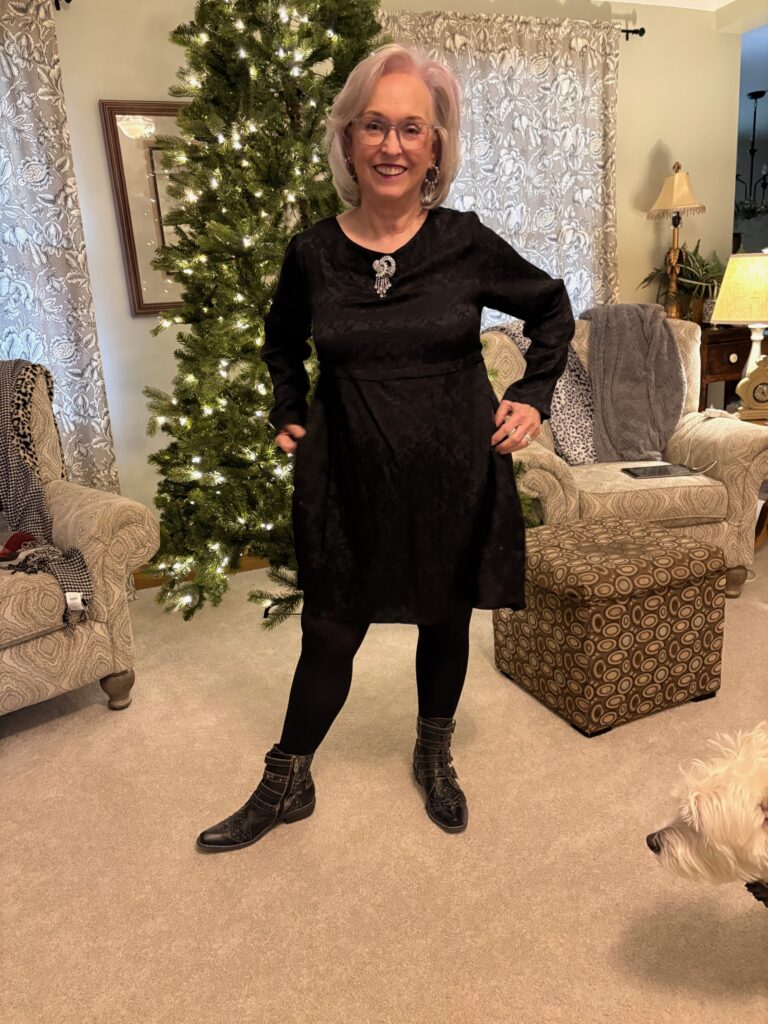 I decided to “cowboy” it up a bit with my Rodeha boots. That’s the exact first sentence I used for The Lewk for our last Songful Style. It definitely applies here, too! I added this sparkly brooch I got at LS Ayres (now Macy’s) decades ago. The earrings are new and are from J Crew.