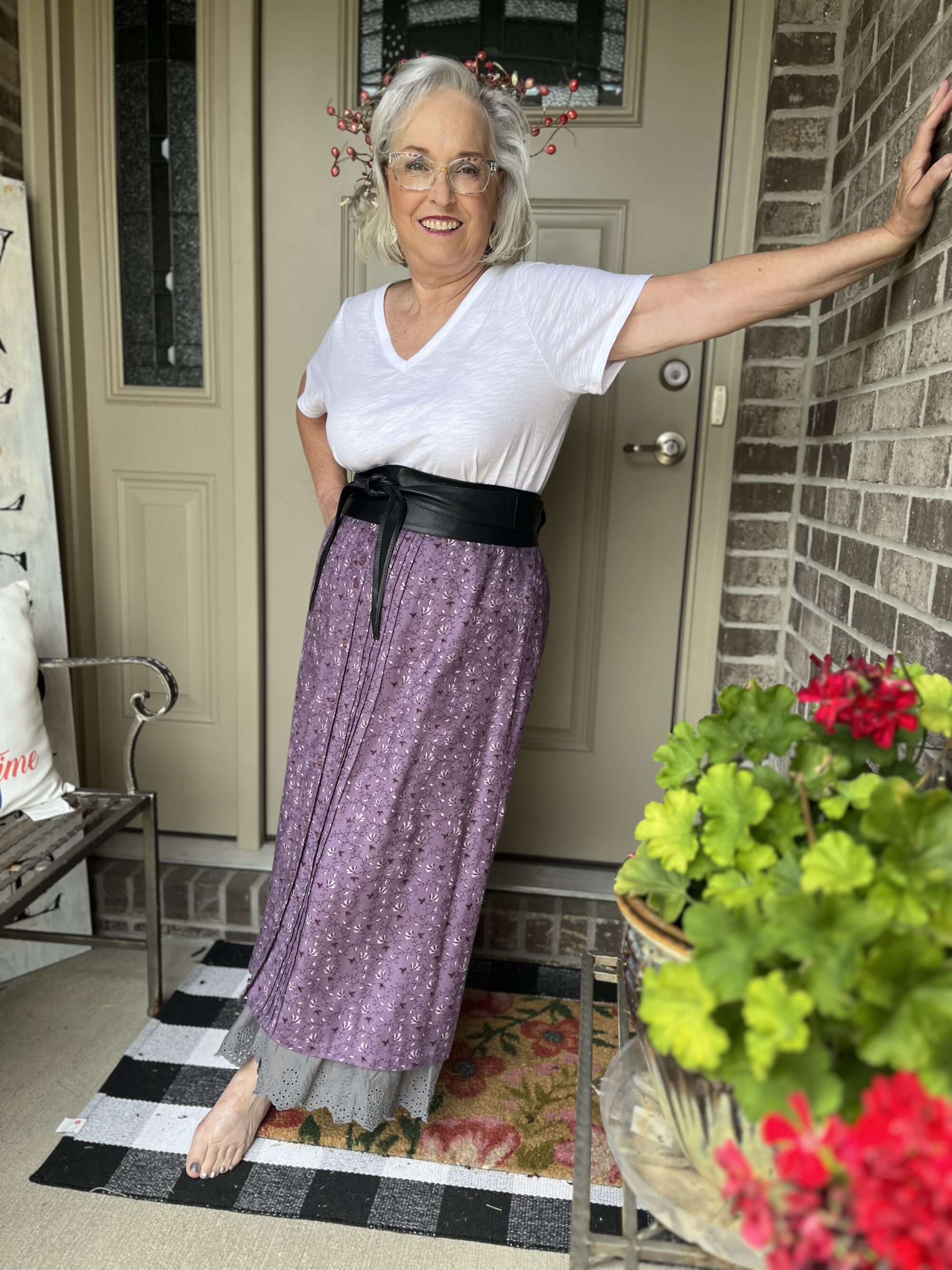 Well, this one took a couple of visits into the closet! I ended up with a reverse of our young woman because I don’t have any purple slips. I did try a grey skirt over a purple dress. That just looked silly. But, what I did have was a grey slip and a purple skirt. It looks like she’s wearing a corset, but I used my leather obi-style belt instead. One would think I would have a white peasant top in my closet. One would be wrong. I chose a v neck tee shirt from Old Navy. It’s funny how much I dislike v necks in other things, but I love them in tee shirts! My skirt has to surely be vintage by now and is from April Cornell. The slip is from Gudrun Sjoden. Overall, I rather like the look!
