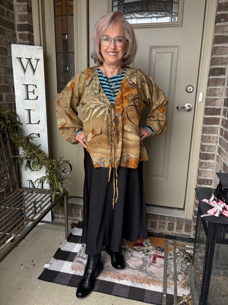 OK, I confess! I bought the Miz Mooz Leighton boots in black. My black Born boots are beginning to show some wear, and I know these boots are comfortable right out of the box. I added a J Jill necklace and matching earrings along with a very old Stella & Dot necklace to further showcase the golden colors in the painting.