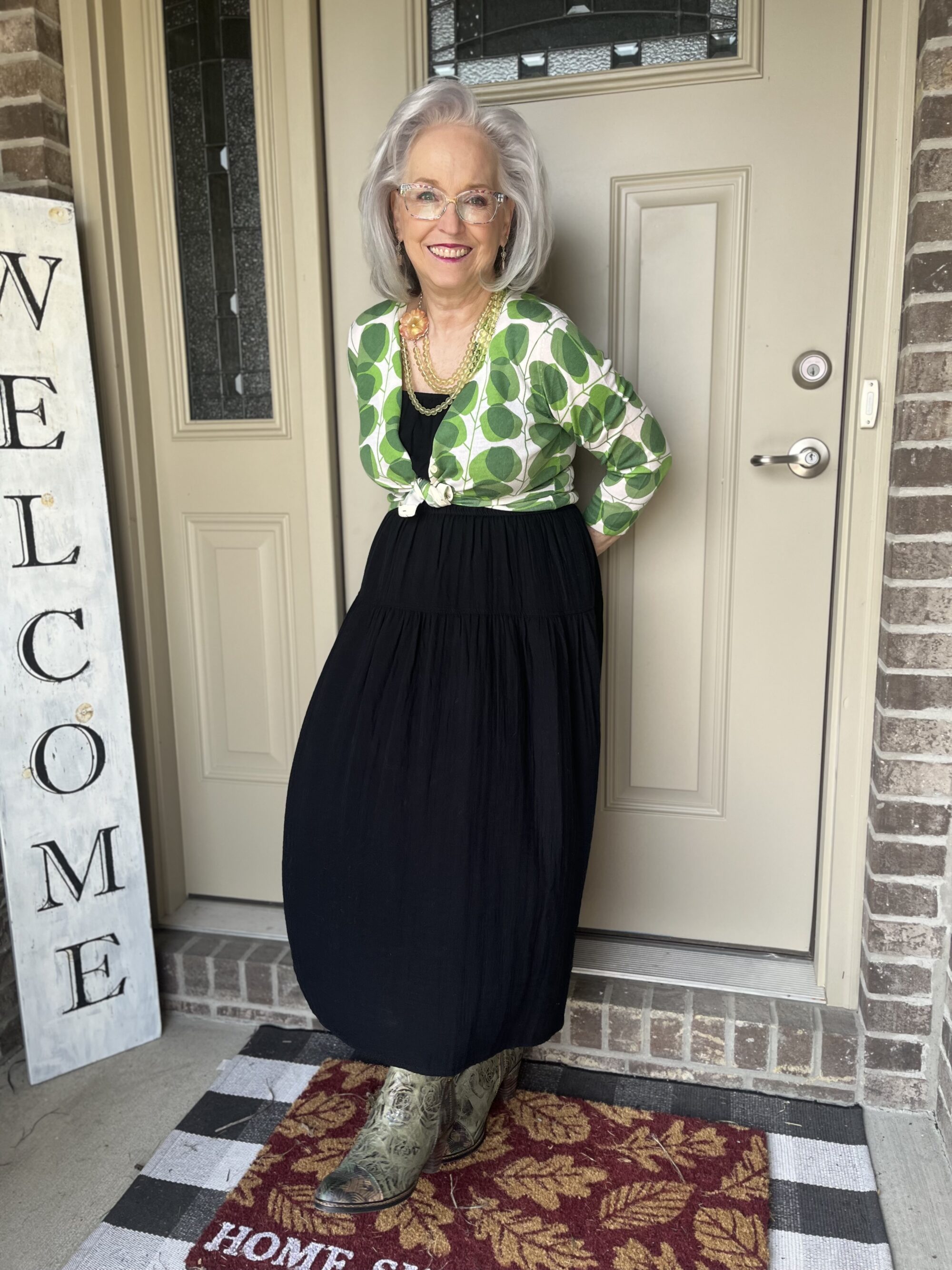 Very glam, Marsha. I love the crisp contrast of the black and green and the short top suits you/sharpens the outfit. Fabulous necklace too.