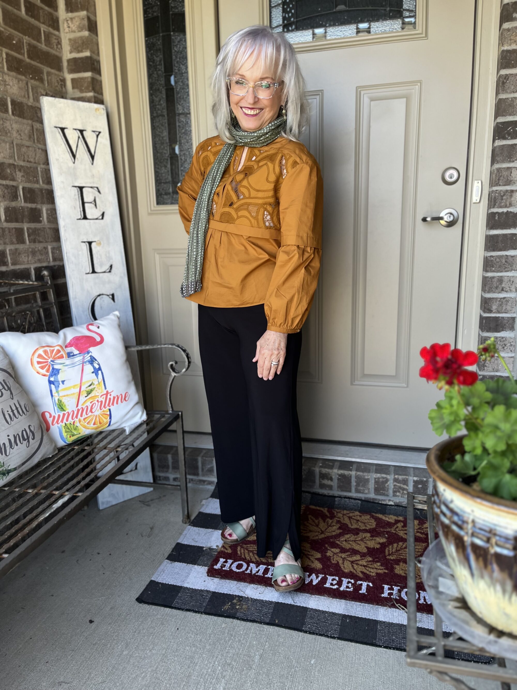 I commented to a few people that I had a plan for this art. I kinda stuck to that, but I had to make some adjustments. I had thought this top buttoned up the front all the way since it doesn’t button at all! It’s from Banana Republic, and I love the color and the cutwork. I planned to wear it open over my Clara Sunwoo jumpsuit (seen here). I probably could have still worn it with the jumpsuit. I decided to pivot, however, and chose my Clara Sunwoo Signature Side Slit Ankle Pant. I then added a green scarf with polka dots as a nod to the vines pumpkins grow from as well as…well, polka dots! Many, many years ago, I had a black sweater with sequined pumpkins all over it. I wore it when I taught during the Halloween season. But, I donated it when I retired. And, that would be all I had with pumpkins on it!