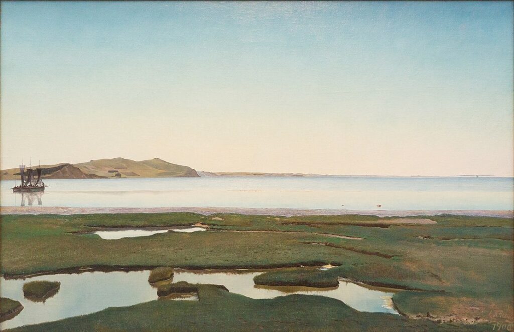 "The windless fjord is depicted at that time of the morning, when the sun is just rising, but has not yet gained warmth and strength. The cold blue light of the sky permeates the color scheme of the entire picture. In the foreground, the wide salt marsh, pierced by tidal holes, forms a blue-green surface. The light of the sky is reflected in the water and it seems as if there is not quite solid ground under your feet. On the fjord, on the left side, three fishing boats that have dropped anchor to clean nets are seen, and in the background of the picture, a characteristic hilly moraine landscape can be seen, which can be identified as Hvideklint, south of Frederiksværk. The atmospheric panorama is considered one of the main works of Danish art. It was painted at the turn of the century in 1900. Ring is 46 years old and a new father when he paints the picture. The new life with his wife Sigrid (born Kähler) and children has a decisive impact on the life and art of the middle-aged artist. It is a new time that is being heralded, the coming of a new day, the emergence of a new world (source)."