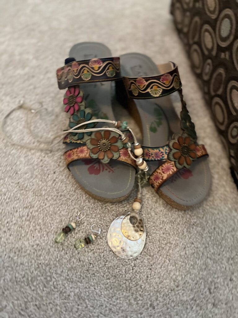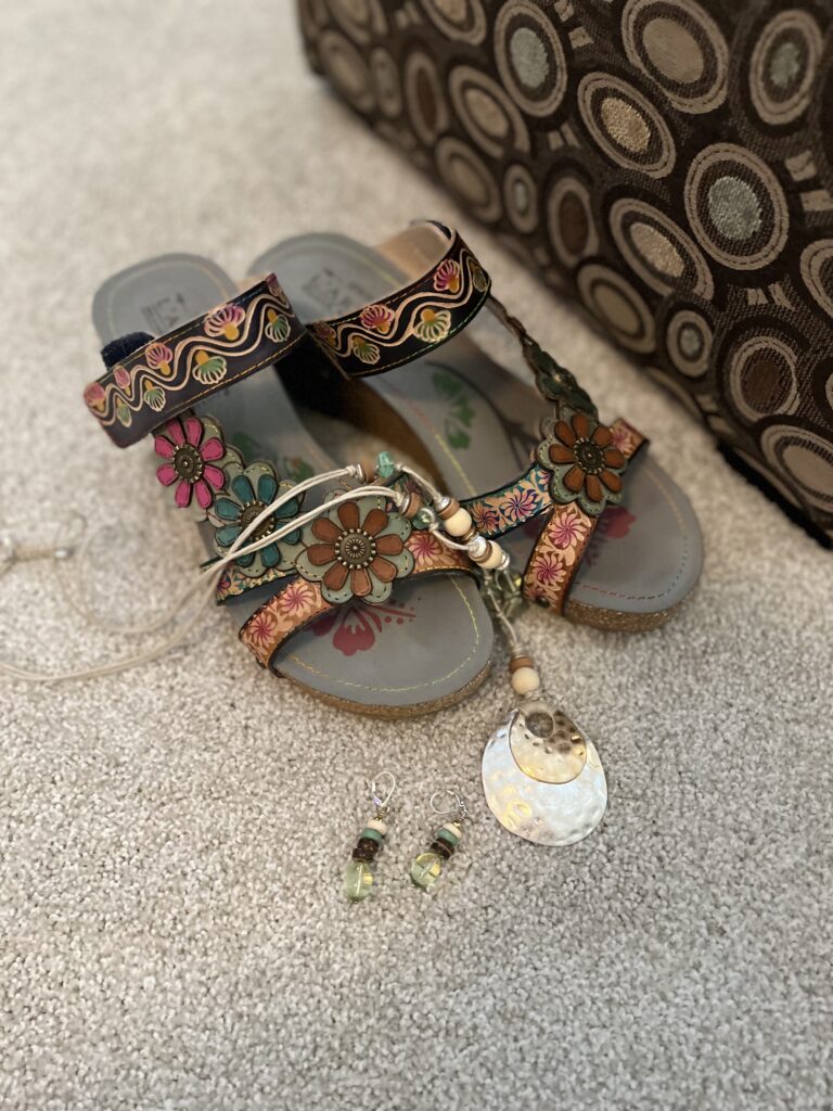As I said, this painting, beautiful as it is, really stumped me. I chose these L’Artiste Delight slides simply because they contained earthy colors I saw in the painting. The foreground seems to contain lots of green so I thought this necklace and earrings from J Jill picked that up a bit.